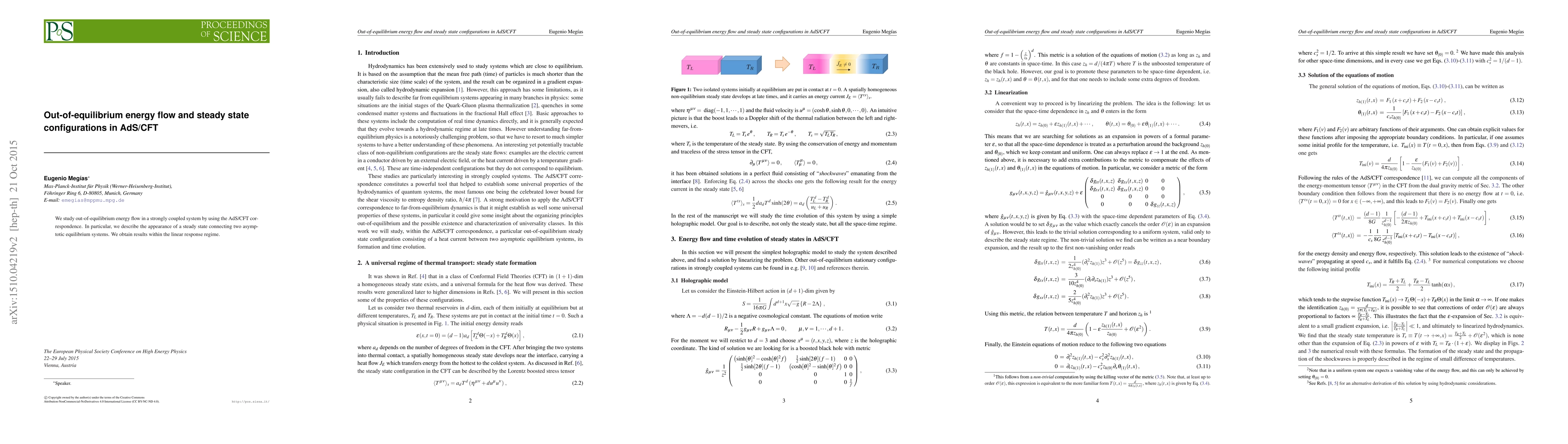 This paper investigates out-of-equilibrium energy dynamics in strongly coupled systems via the AdS/CFT correspondence, revealing the emergence of a steady state linking two asymptotic equilibrium states, with findings derived in the linear response regime.
