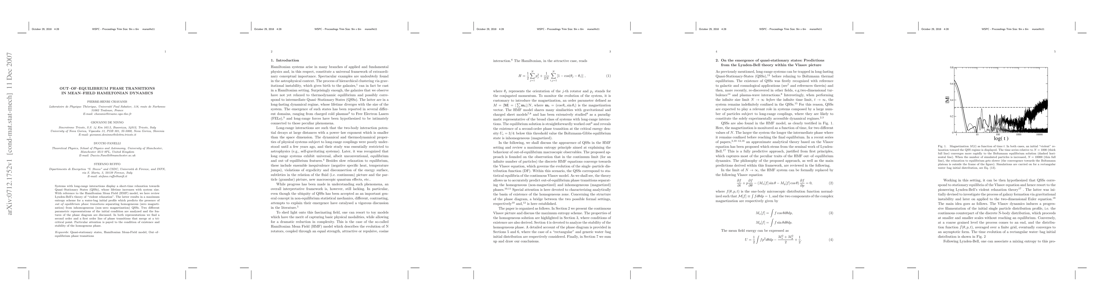 This paper reviews the Hamiltonian Mean Field model's violent relaxation leading to Quasi-Stationary States (QSSs) in systems with long-range interactions. It explores Lynden-Bell's theory and identifies out-of-equilibrium phase transitions between homogeneous and inhomogeneous QSSs, revealing a tricritical point where second and first order transition lines merge.