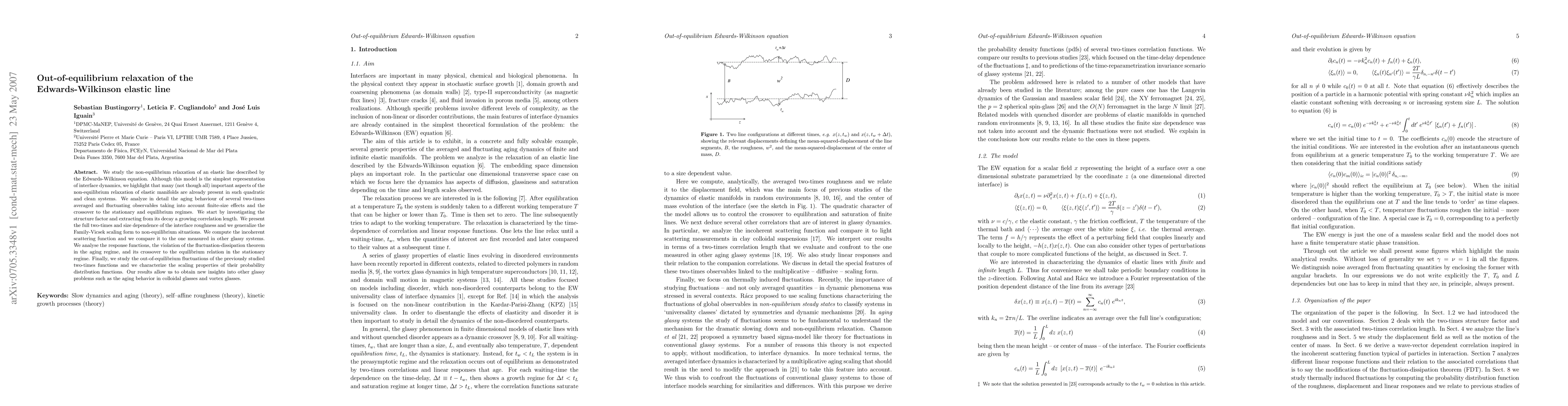 This paper explores the non-equilibrium relaxation dynamics of the Edwards-Wilkinson elastic line, revealing aging behavior and crossover to equilibrium through detailed analysis of structure factors, interface roughness, and response functions. The study provides insights into the broader context of glassy systems and their aging phenomena.