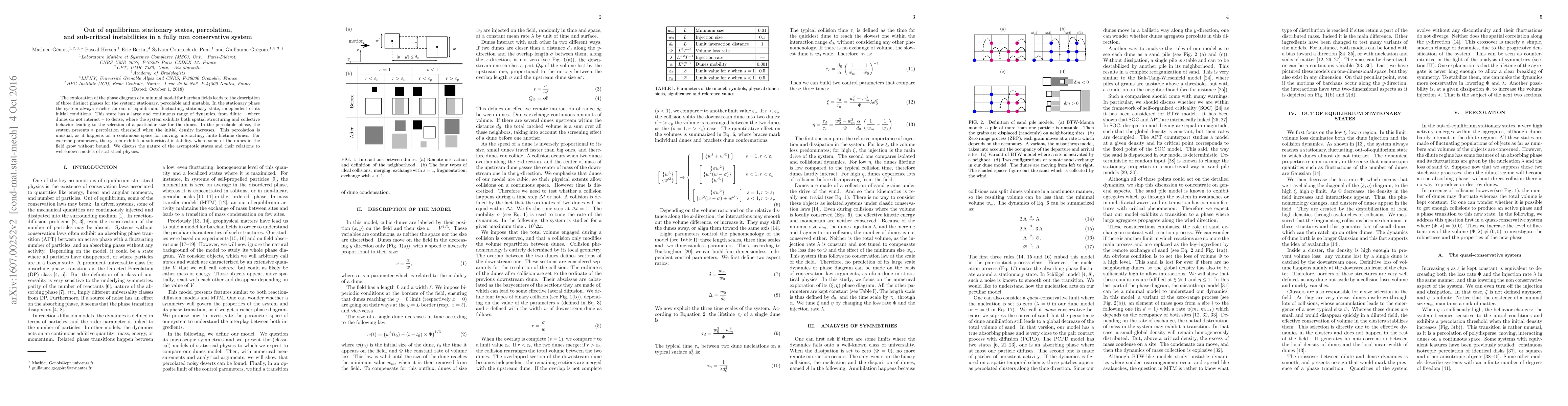 The exploration of the phase diagram of a minimal model for barchan fields leads to the description of three distinct phases for the system: stationary, percolable and unstable. In the stationary phase the system always reaches an out of equilibrium, fluctuating, stationary state, independent of its initial conditions. This state has a large and continuous range of dynamics, from dilute -- where dunes do not interact -- to dense, where the system exhibits both spatial structuring and collective behavior leading to the selection of a particular size for the dunes. In the percolable phase, the system presents a percolation threshold when the initial density increases. This percolation is unusual, as it happens on a continuous space for moving, interacting, finite lifetime dunes. For extreme parameters, the system exhibits a sub-critical instability, where some of the dunes in the field grow without bound. We discuss the nature of the asymptotic states and their relations to well-known models of statistical physics.