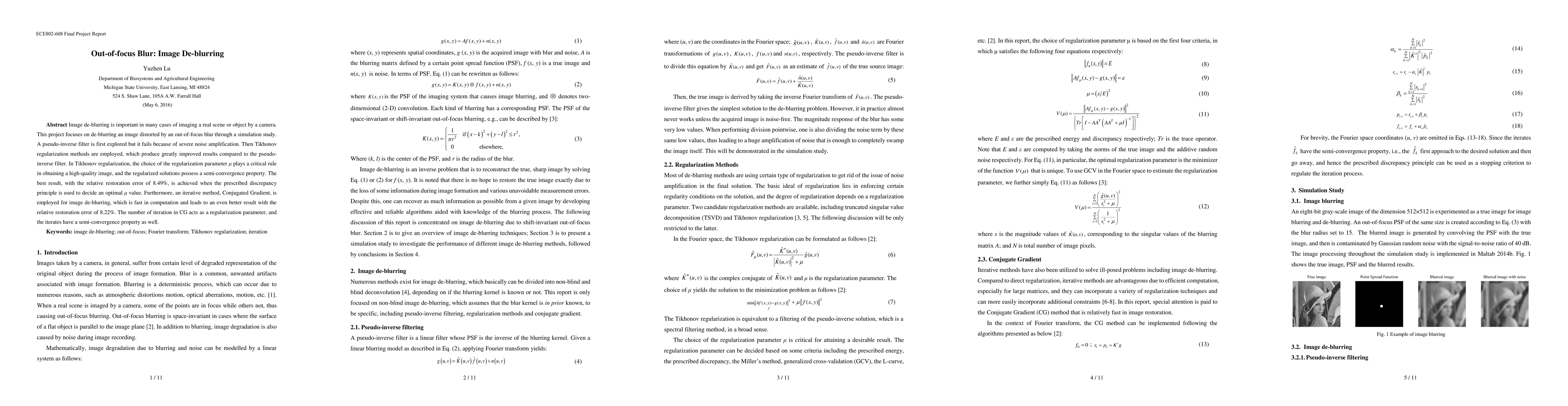 Image de-blurring is important in many cases of imaging a real scene or object by a camera. This project focuses on de-blurring an image distorted by an out-of-focus blur through a simulation study. A pseudo-inverse filter is first explored but it fails because of severe noise amplification. Then Tikhonov regularization methods are employed, which produce greatly improved results compared to the pseudo-inverse filter. In Tikhonov regularization, the choice of the regularization parameter plays a critical rule in obtaining a high-quality image, and the regularized solutions possess a semi-convergence property. The best result, with the relative restoration error of 8.49%, is achieved when the prescribed discrepancy principle is used to decide an optimal value. Furthermore, an iterative method, Conjugated Gradient, is employed for image de-blurring, which is fast in computation and leads to an even better result with the relative restoration error of 8.22%. The number of iteration in CG acts as a regularization parameter, and the iterates have a semi-convergence property as well.
