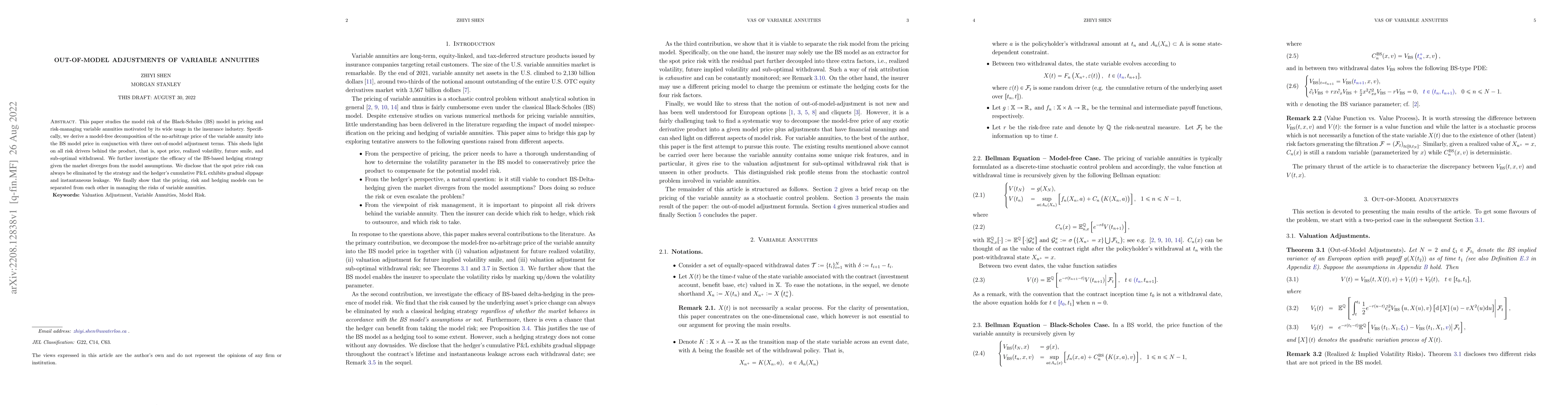 This paper examines the model risk of the Black-Scholes model in pricing and managing variable annuities, proposing a model-free decomposition that includes out-of-model adjustments. It reveals that while the BS-based hedging strategy can eliminate spot price risk, it leads to gradual slippage and leakage in cumulative P&L, highlighting the separation of pricing, risk, and hedging models for better risk management.