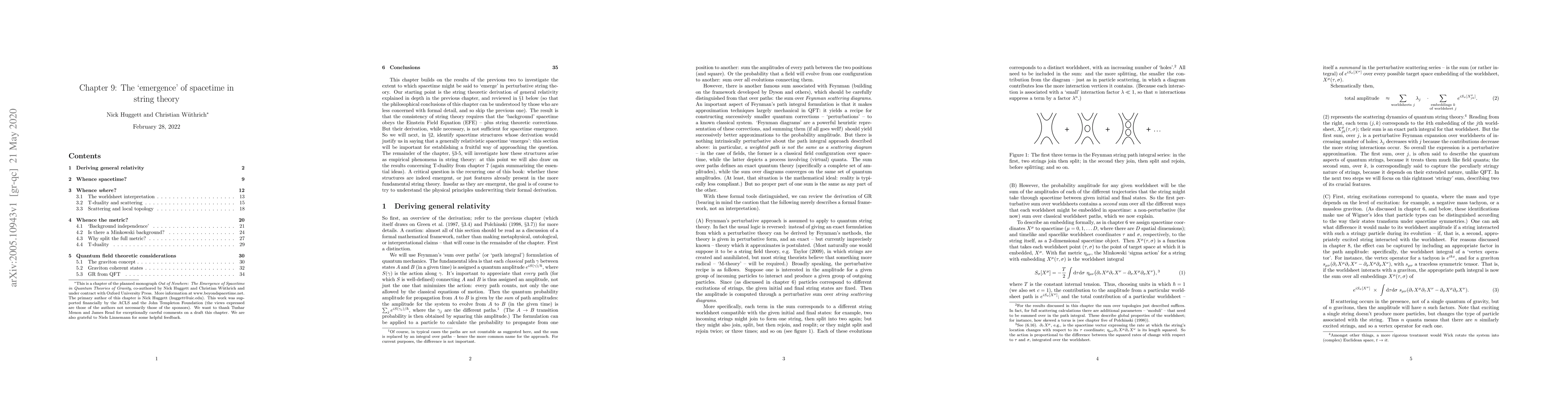 This is a chapter of the planned monograph "Out of Nowhere: The Emergence of Spacetime in Quantum Theories of Gravity", co-authored by Nick Huggett and Christian W\"uthrich and under contract with Oxford University Press. (More information at www.beyondspacetime.net.) This chapter analyses the nature and derivation of spacetime topology and geometry according to string theory.