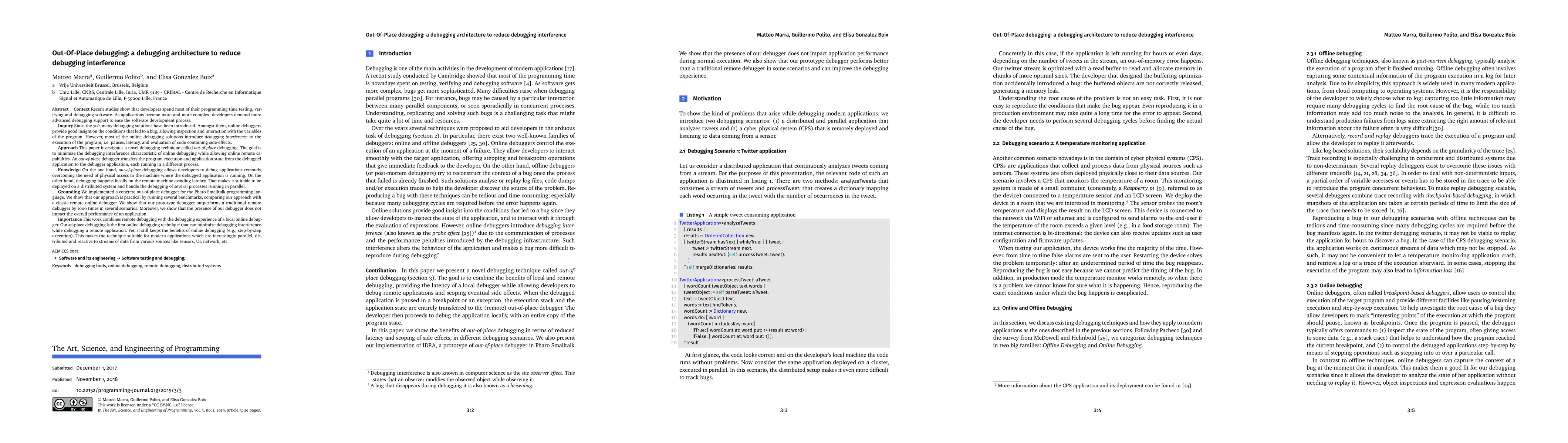 This paper introduces out-of-place debugging, a novel technique to minimize debugging interference while enabling remote debugging. The approach transfers execution and state from the debugged application to a separate debugger process, achieving remote debugging without the latency and performance impacts typical of traditional online debuggers.