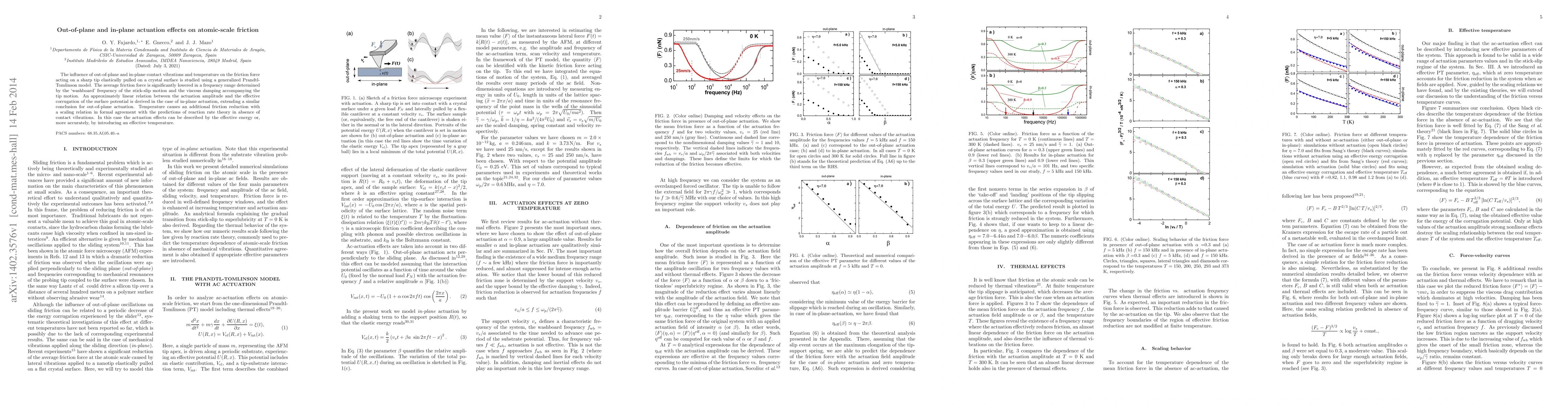 This paper investigates how out-of-plane and in-plane vibrations and temperature affect atomic-scale friction using a generalized Prandtl-Tomlinson model, revealing significant friction reduction at specific frequencies and a linear relation between actuation amplitude and surface potential corrugation. Temperature further reduces friction, with effects described by an effective temperature concept.