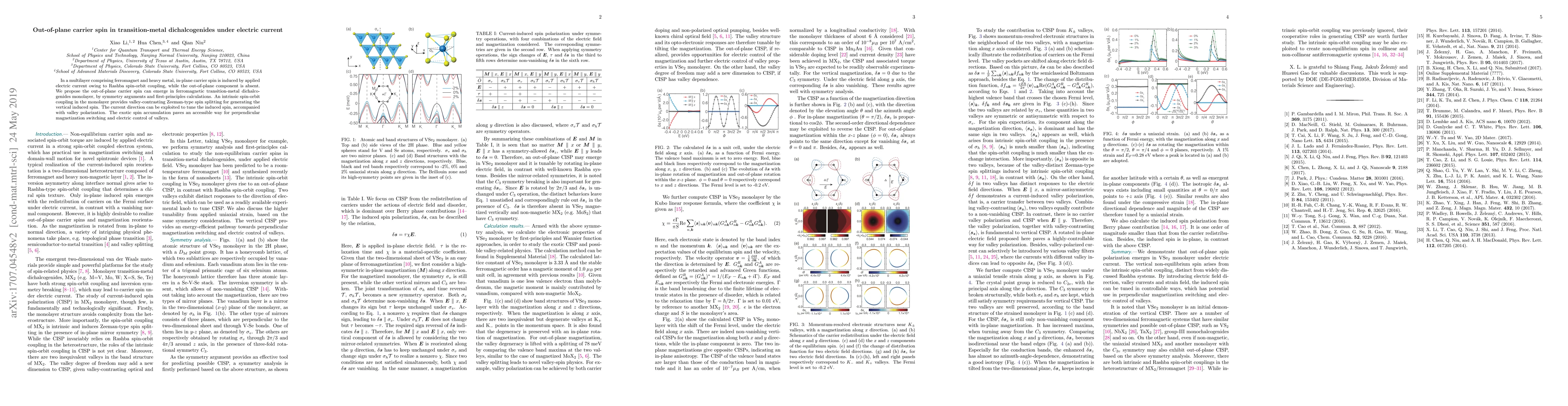 This paper proposes that out-of-plane carrier spin can emerge in ferromagnetic transition-metal dichalcogenides monolayers under electric current, driven by intrinsic spin-orbit coupling and tunable by current direction, enabling electric control of valleys and perpendicular magnetization switching. First-principles calculations support the theoretical symmetry arguments for this phenomenon.