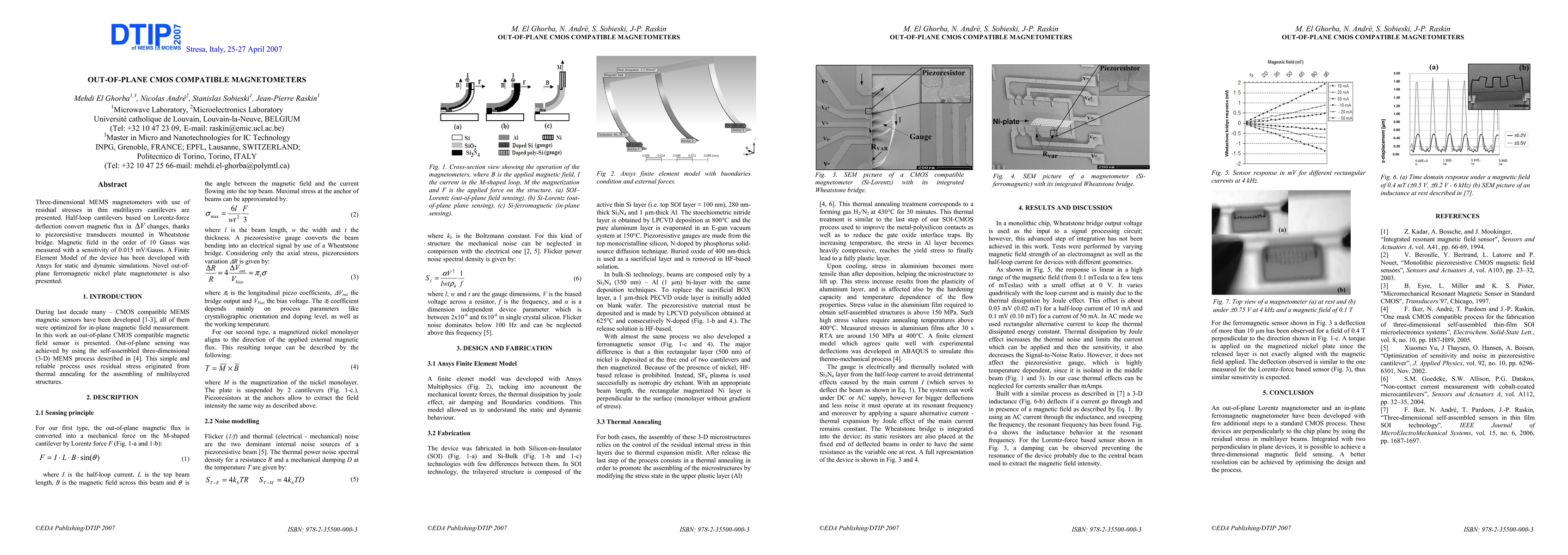 Three-dimensional MEMS magnetometers with use of residual stresses in thin multilayers cantilevers are presented. Half-loop cantilevers based on Lorentz-force deflection convert magnetic flux in changes, thanks to piezoresistive transducers mounted in Wheatstone bridge. Magnetic field in the order of 10 Gauss was measured with a sensitivity of 0.015 mV/Gauss. A Finite Element Model of the device has been developed with Ansys for static and dynamic simulations. Novel out-of-plane ferromagnetic nickel plate magnetometer is also presented.