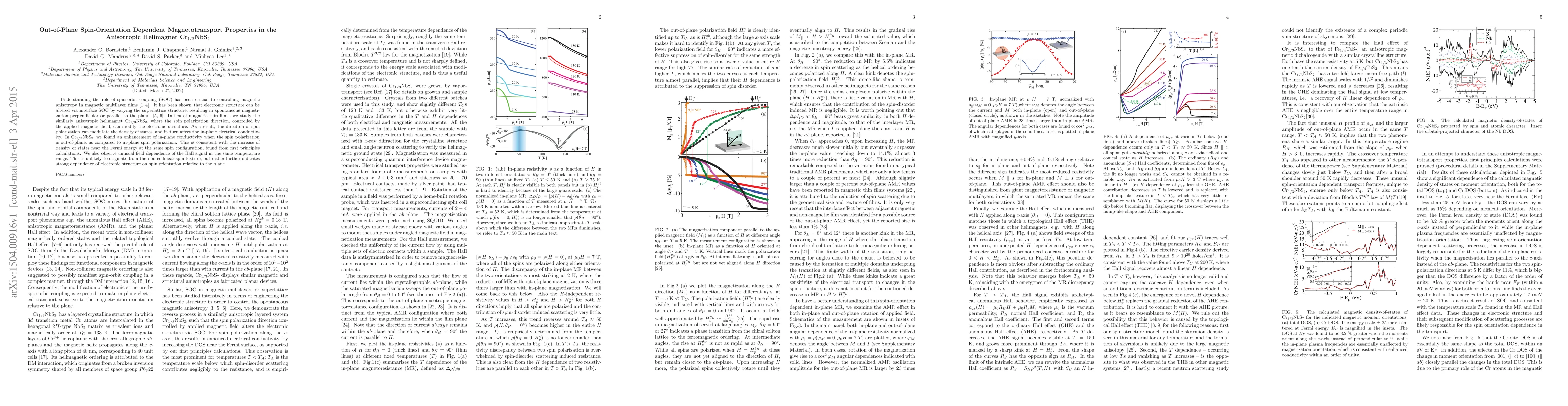 This study investigates the magnetotransport properties of the anisotropic helimagnet Cr$_{1/3}$NbS$_2$, finding enhanced in-plane conductivity when spin polarization is out-of-plane due to increased density of states near the Fermi level. Unusual field dependence of the Hall signal further suggests strong electronic structure modulation by spin orientation relative to the plane.