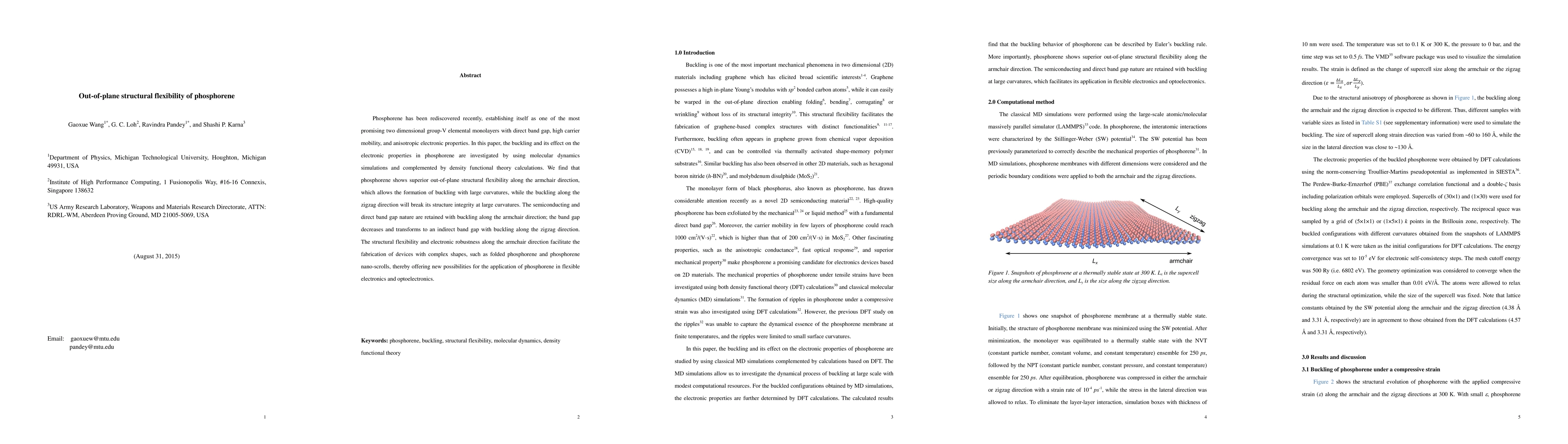 This paper investigates the out-of-plane structural flexibility of phosphorene using molecular dynamics and DFT calculations, finding that phosphorene can form large curvatures along the armchair direction without losing its semiconducting properties, while buckling along the zigzag direction compromises its structure. This flexibility opens new avenues for phosphorene applications in flexible electronics and optoelectronics.