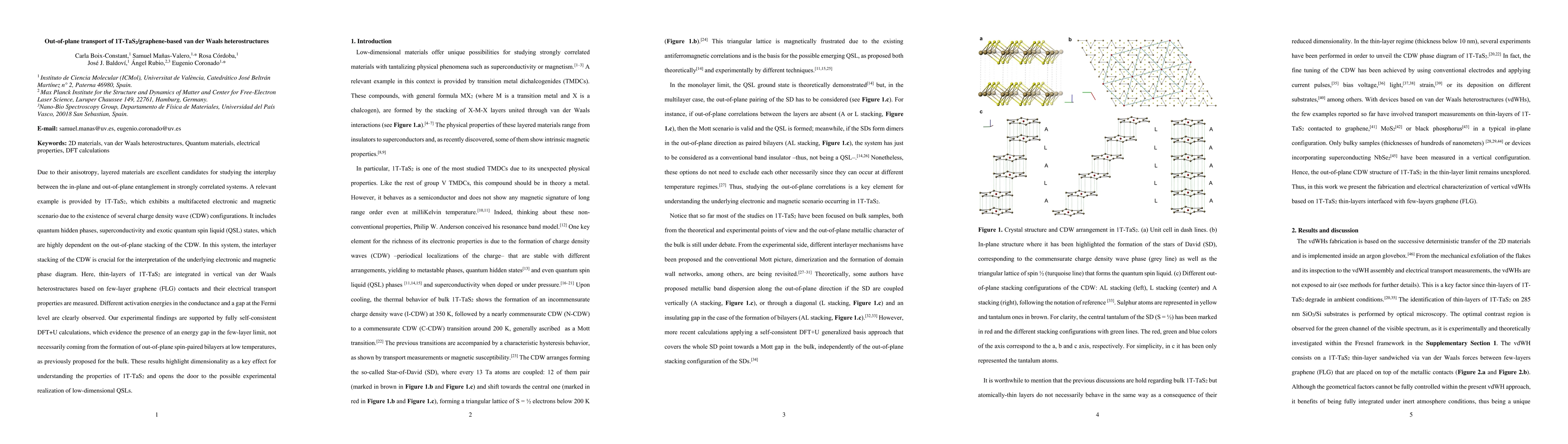 Due to their anisotropy, layered materials are excellent candidates for studying the interplay between the in-plane and out-of-plane entanglement in strongly correlated systems. A relevant example is provided by 1T-TaS2, which exhibits a multifaceted electronic and magnetic scenario due to the existence of several charge density wave (CDW) configurations. It includes quantum hidden phases, superconductivity and exotic quantum spin liquid (QSL) states, which are highly dependent on the out-of-plane stacking of the CDW. In this system, the interlayer stacking of the CDW is crucial for the interpretation of the underlying electronic and magnetic phase diagram. Here, thin-layers of 1T-TaS2 are integrated in vertical van der Waals heterostructures based on few-layer graphene (FLG) contacts and their electrical transport properties are measured. Different activation energies in the conductance and a gap at the Fermi level are clearly observed. Our experimental findings are supported by fully self-consistent DFT+U calculations, which evidence the presence of an energy gap in the few-layer limit, not necessarily coming from the formation of out-of-plane spin-paired bilayers at low temperatures, as previously proposed for the bulk. These results highlight dimensionality as a key effect for understanding the properties of 1T-TaS2 and opens the door to the possible experimental realization of low-dimensional QSLs.