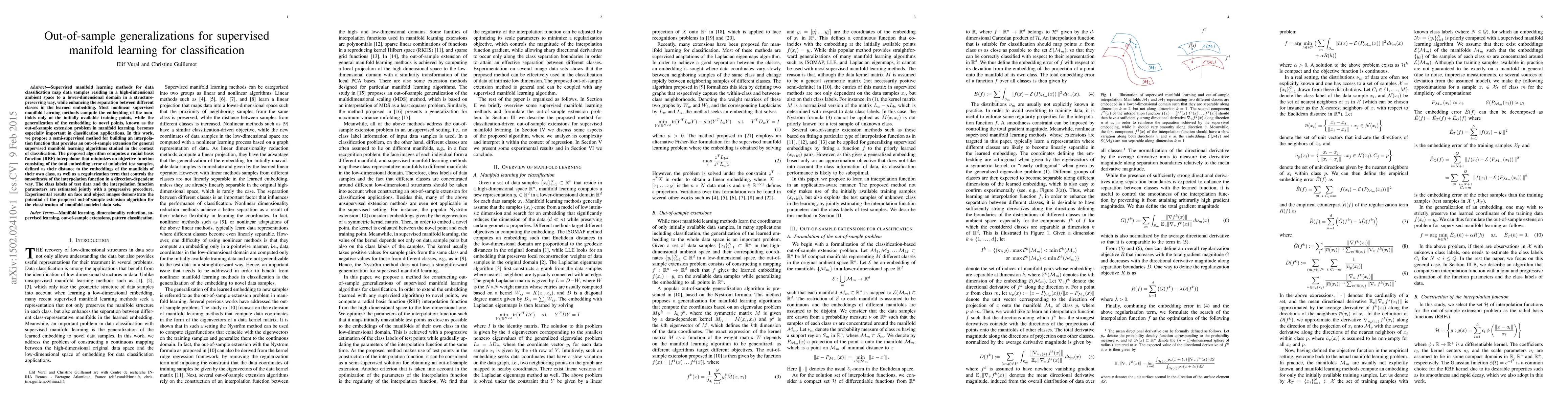 This paper proposes a semi-supervised method for out-of-sample extension in supervised manifold learning, enhancing classification by interpolating embeddings for new data points using a radial basis function interpolator. Experimental results show improved classification performance on face and object image datasets.