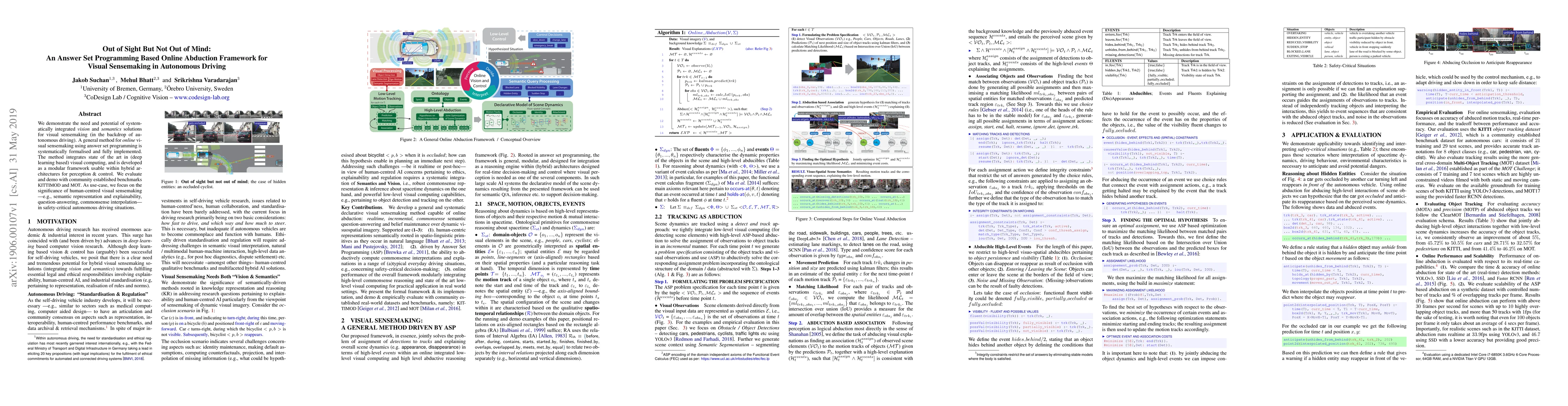We demonstrate the need and potential of systematically integrated vision and semantics} solutions for visual sensemaking (in the backdrop of autonomous driving). A general method for online visual sensemaking using answer set programming is systematically formalised and fully implemented. The method integrates state of the art in (deep learning based) visual computing, and is developed as a modular framework usable within hybrid architectures for perception & control. We evaluate and demo with community established benchmarks KITTIMOD and MOT. As use-case, we focus on the significance of human-centred visual sensemaking ---e.g., semantic representation and explainability, question-answering, commonsense interpolation--- in safety-critical autonomous driving situations.