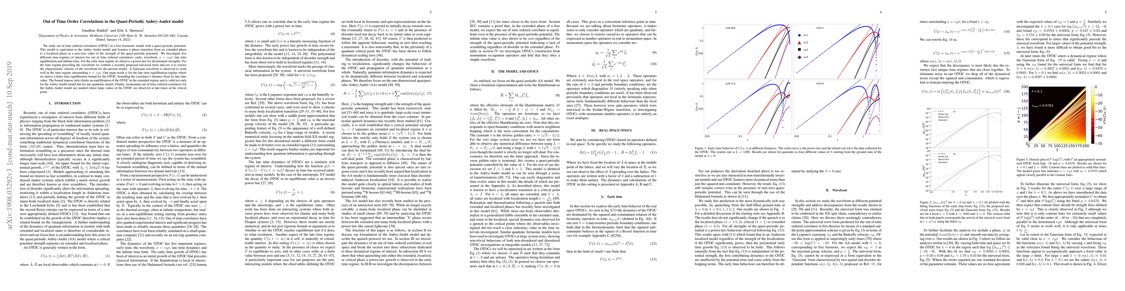 We study out of time ordered correlators (OTOC) in a free fermionic model with a quasi-periodic potential. This model is equivalent to the Aubry-Andr\'e model and features a phase transition from an extended phase to a localized phase at a non-zero value of the strength of the quasi-periodic potential. We investigate five different time-regimes of interest for out of time ordered correlators; early, wavefront, $x=v_Bt$, late time equilibration and infinite time. For the early time regime we observe a power law for all potential strengths. For the time regime preceding the wavefront we confirm a recently proposed universal form and use it to extract the characteristic velocity of the wavefront for the present model. A Gaussian waveform is observed to work well in the time regime surrounding $x=v_Bt$. Our main result is for the late time equilibration regime where we derive a finite time equilibration bound for the OTOC, bounding the correlator's distance from its late time value. The bound impose strict limits on equilibration of the OTOC in the extended regime ans is valid not only for the Aubry-Andr\'e model but for any quadratic model model. Finally, momentum out of time ordered correlators for the Aubry-Andr\'e model are studied where large values of the OTOC are observed at late times at the critical point.
