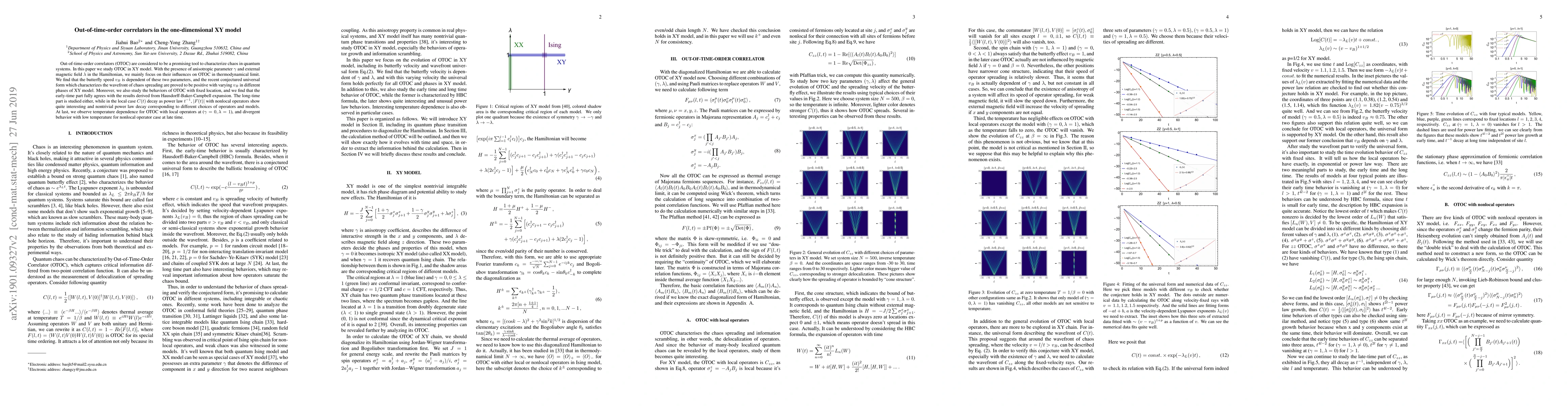 Researchers studied out-of-time-order correlators (OTOC) in a 1D XY model with anisotropic parameter and external magnetic field, finding that OTOC is influenced by these parameters and exhibits temperature-dependent behavior.