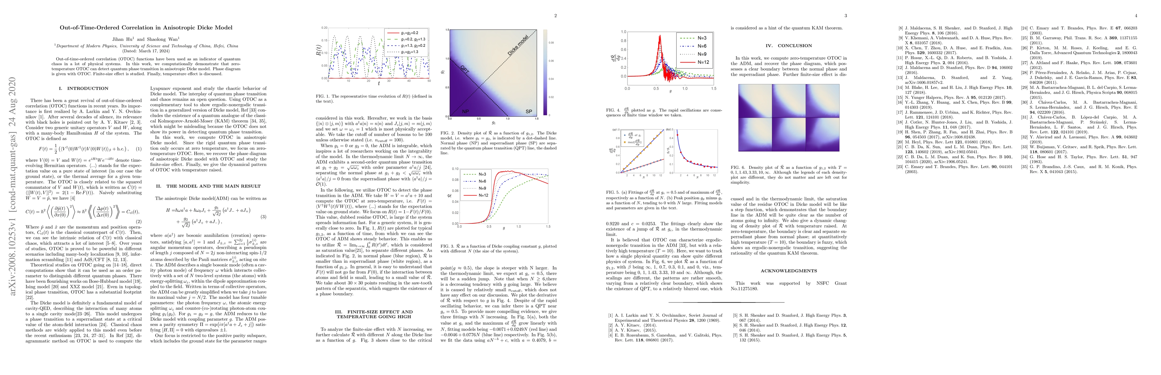 Out-of-time-ordered correlation (OTOC) functions have been used as an indicator of quantum chaos in a lot of physical systems. In this work, we computationally demonstrate that zerotemperature OTOC can detect quantum phase transition in anisotropic Dicke model. Phase diagram is given with OTOC. Finite-size effect is studied. Finally, temperature effect is discussed.