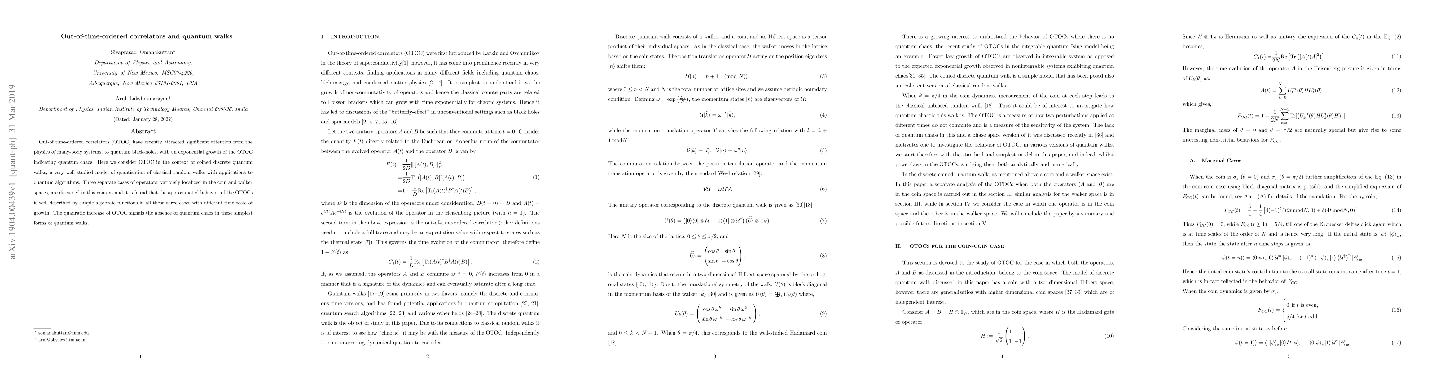 This paper investigates out-of-time-ordered correlators (OTOC) in the context of coined discrete quantum walks, finding that OTOCs exhibit simple algebraic growth rather than exponential, indicating the absence of quantum chaos in these quantum walk models. The study discusses three cases of operator localization and concludes that the quadratic increase of OTOCs signals the lack of quantum chaos in these simplest quantum walk forms.