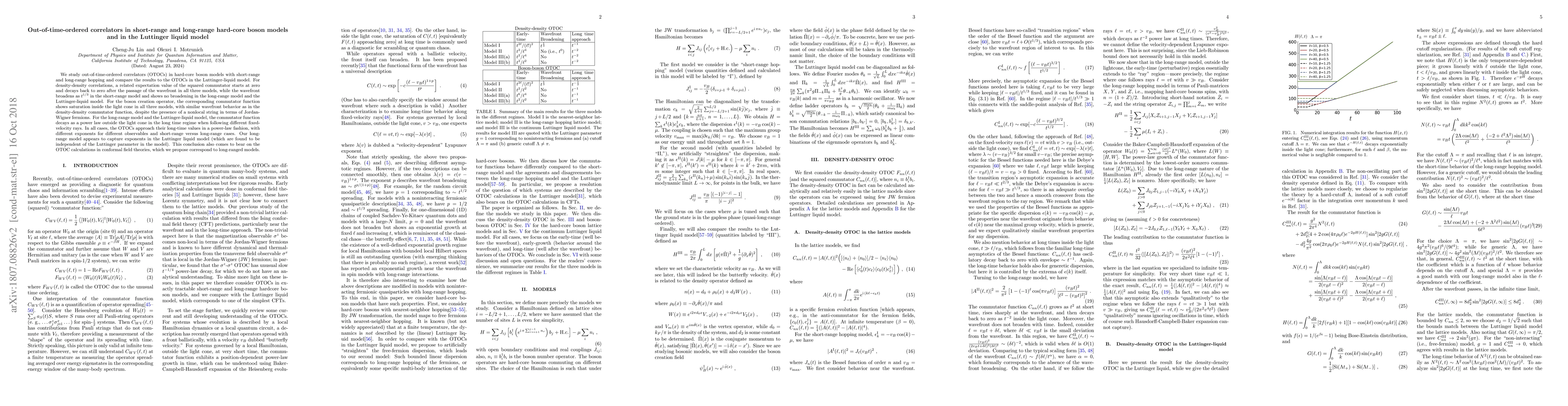 We study out-of-time-ordered correlators (OTOC) in hard-core boson models with short-range and long-range hopping and compare the results to the OTOC in the Luttinger liquid model. For the density operator, a related `commutator function' starts at zero and decays back to zero after the passage of the wavefront in all three models, while the wavefront broadens as $t^{1/3}$ in the short-range model and shows no broadening in the long-range model and the Luttinger liquid model. For the boson creation operator, the corresponding commutator function shows saturation inside the light cone in all three models, with similar wavefront behavior as in the density-density commutator function, despite the presence of a nonlocal string in terms of Jordan-Wigner fermions. For the long-range model and the Luttinger liquid model, the commutator function decays as power law outside the light cone in the long time regime when following different fixed-velocity rays. In all cases, the OTOCs approach their long-time values in a power-law fashion, with different exponents for different observables and short-range vs long-range cases. Our long-range model appears to capture exponents in the Luttinger liquid model (which are found to be independent of the Luttinger parameter in the model). This conclusion also bears on the OTOC calculations in conformal field theories, which we propose correspond to long-ranged models.