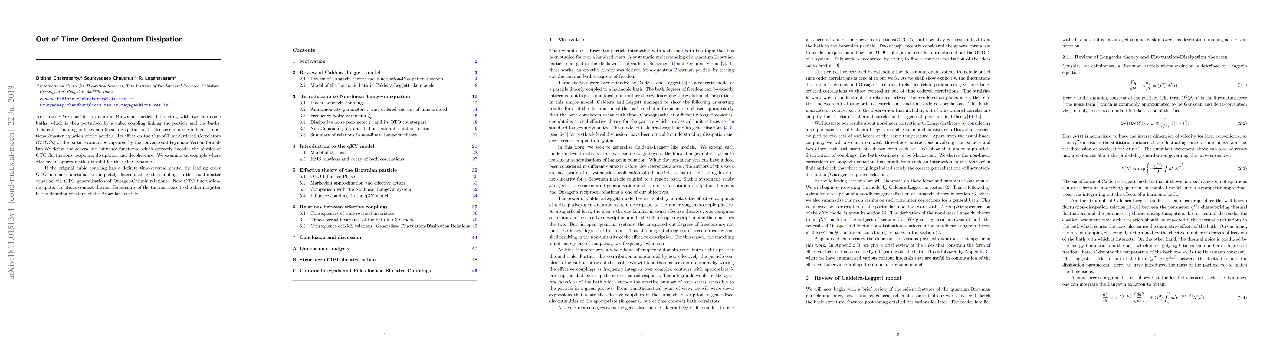 This paper investigates quantum dissipation in a particle interacting with two harmonic baths, focusing on non-linear effects from a cubic coupling. It derives a generalized influence functional that captures Out-of-Time-Ordered Correlators (OTOCs) and reveals new OTO fluctuation-dissipation relations linking thermal noise and damping.