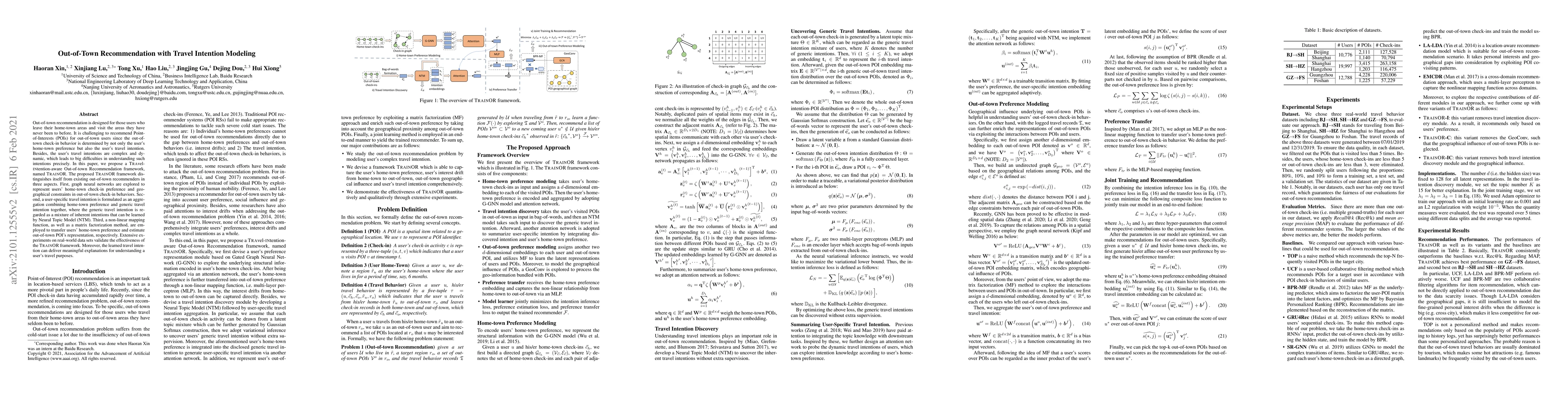 The paper proposes TRAINOR, a framework for recommending Points-of-Interest (POIs) for out-of-town users by modeling their travel intentions. It utilizes graph neural networks, a Neural Topic Model, and matrix factorization to integrate home-town preferences and travel intentions, validated through experiments on real-world datasets.