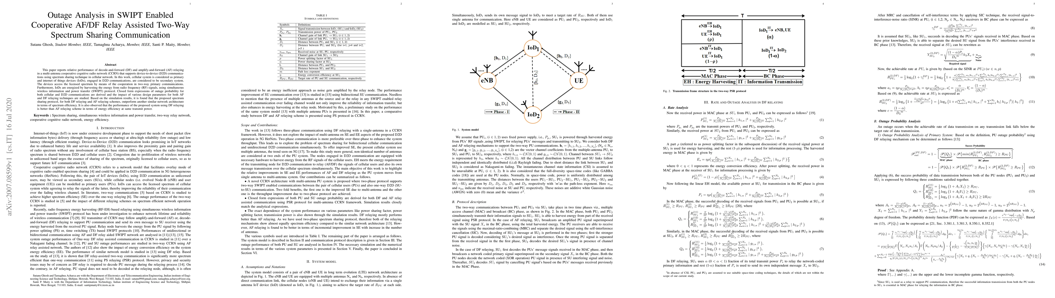 This paper reports relative performance of decode-and-forward (DF) and amplify-and-forward (AF) relaying in a multi-antenna cooperative cognitive radio network (CCRN) that supports device-to-device (D2D) communications using spectrum sharing technique in cellular network. In this work, cellular system is considered as primary and internet of things devices (IoDs), engaged in D2D communications, are considered to be secondary system. The devices access the licensed spectrum by means of the cooperation in two-way primary communications. Furthermore, IoDs are energized by harvesting the energy from radio frequency (RF) signals, using simultaneous wireless information and power transfer (SWIPT) protocol. Closed form expressions of outage probability for both cellular and D2D communications are derived and the impact of various design parameters for both AF and DF relaying techniques are studied. Based on the simulation results, it is found that the proposed spectrum sharing protocol, for both DF relaying and AF relaying schemes, outperform another similar network architecture in terms of spectrum efficiency. It is also observed that the performance of the proposed system using DF relaying is better than AF relaying scheme in terms of energy efficiency at same transmit power.