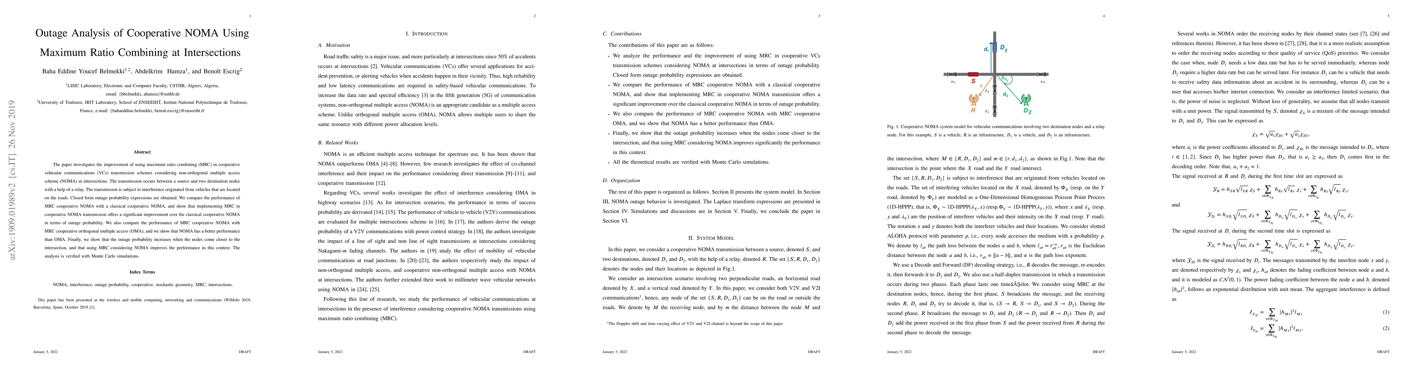 This paper analyzes the outage performance of cooperative NOMA using maximum ratio combining (MRC) in vehicular communications at intersections, showing significant improvement over classical cooperative NOMA and MRC cooperative OMA. Simulation results confirm that MRC-NOMA enhances performance, especially as nodes approach intersections.