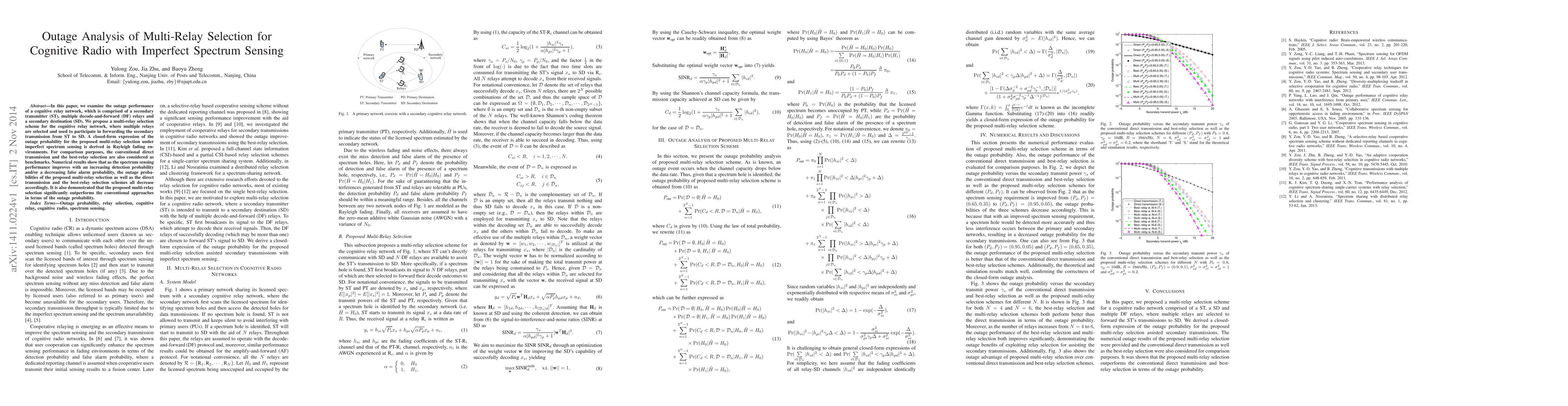 This paper investigates the outage performance of a cognitive relay network using a multi-relay selection scheme under imperfect spectrum sensing, deriving a closed-form expression for outage probability in Rayleigh fading. The proposed method outperforms conventional direct transmission and best-relay selection.