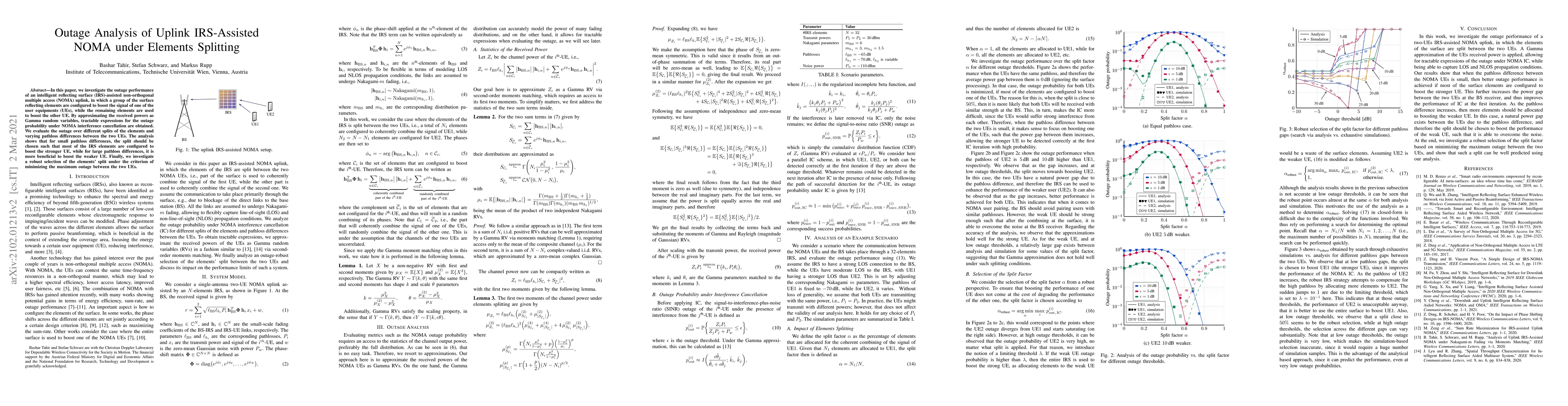This paper analyzes the outage performance of IRS-assisted NOMA uplink systems, finding optimal element splits for different pathloss differences between users. It concludes that boosting the stronger UE is better for small pathloss differences, while boosting the weaker UE is more effective for large differences.