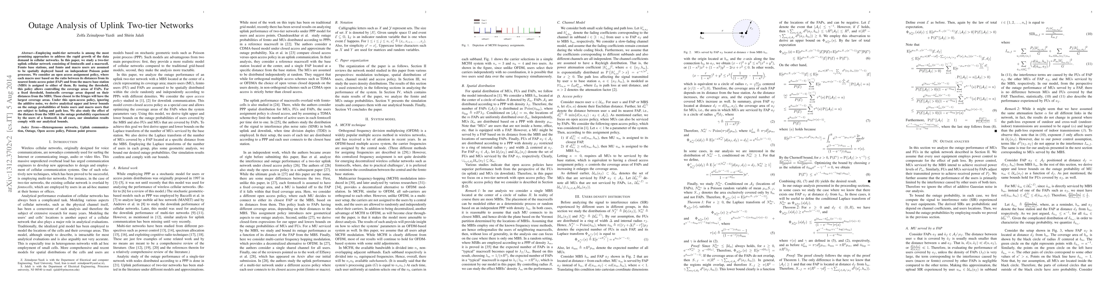 Employing multi-tier networks is among the most promising approaches to address the rapid growth of the data demand in cellular networks. In this paper, we study a two-tier uplink cellular network consisting of femtocells and a macrocell. Femto base stations, and femto and macro users are assumed to be spatially deployed based on independent Poisson point processes. We consider an open access assignment policy, where each macro user based on the ratio between its distances from its nearest femto access point (FAP) and from the macro base station (MBS) is assigned to either of them. By tuning the threshold, this policy allows controlling the coverage areas of FAPs. For a fixed threshold, femtocells coverage areas depend on their distances from the MBS; Those closest to the fringes will have the largest coverage areas. Under this open-access policy, ignoring the additive noise, we derive analytical upper and lower bounds on the outage probabilities of femto users and macro users that are subject to fading and path loss. We also study the effect of the distance from the MBS on the outage probability experienced by the users of a femtocell. In all cases, our simulation results comply with our analytical bounds.