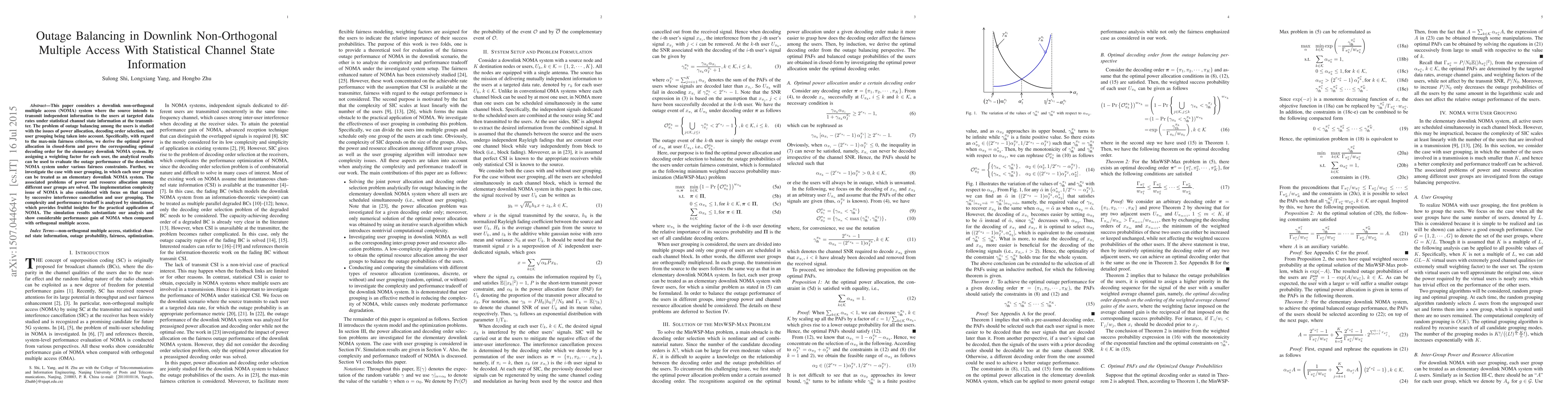 This paper studies outage balancing in downlink NOMA systems with statistical channel state information, deriving optimal power allocation and decoding order for max-min fairness. It also examines user grouping and analyzes the complexity-performance tradeoff, showing NOMA's performance benefits over orthogonal multiple access.