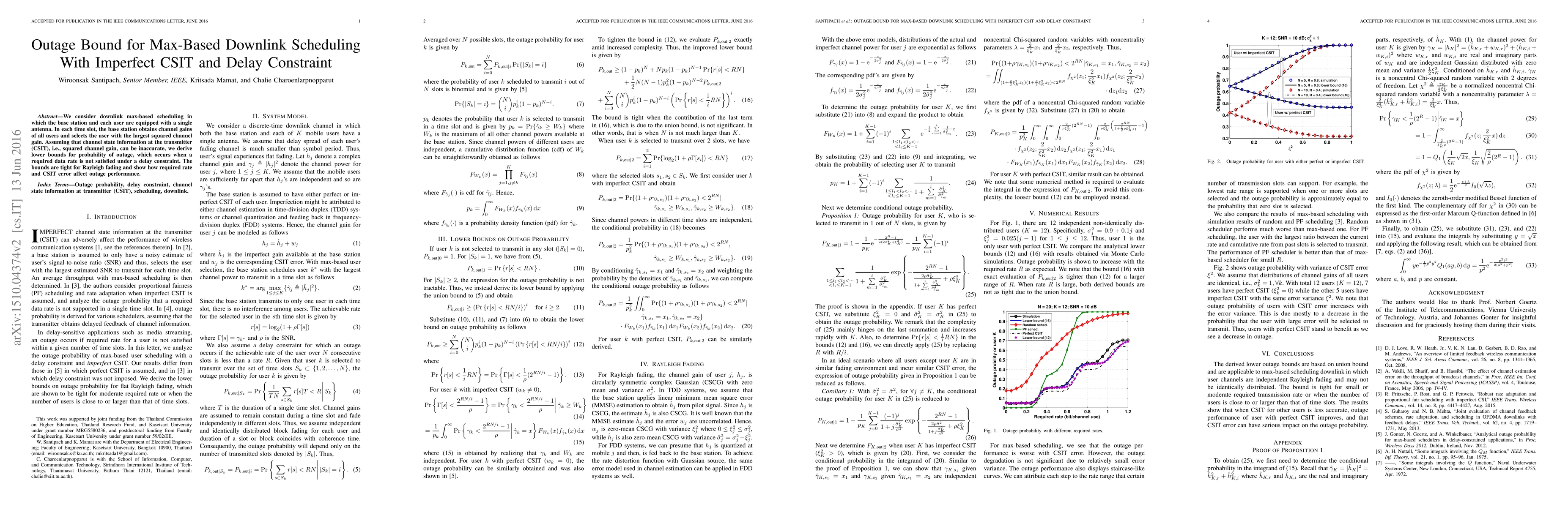 We consider downlink max-based scheduling in which the base station and each user are equipped with a single antenna. In each time slot, the base station obtains channel gains of all users and selects the user with the largest squared channel gain. Assuming that channel state information at the transmitter (CSIT), i.e., squared channel gain, can be inaccurate, we derive lower bounds for probability of outage, which occurs when a required data rate is not satisfied under a delay constraint. The bounds are tight for Rayleigh fading and show how required rate and CSIT error affect outage performance.