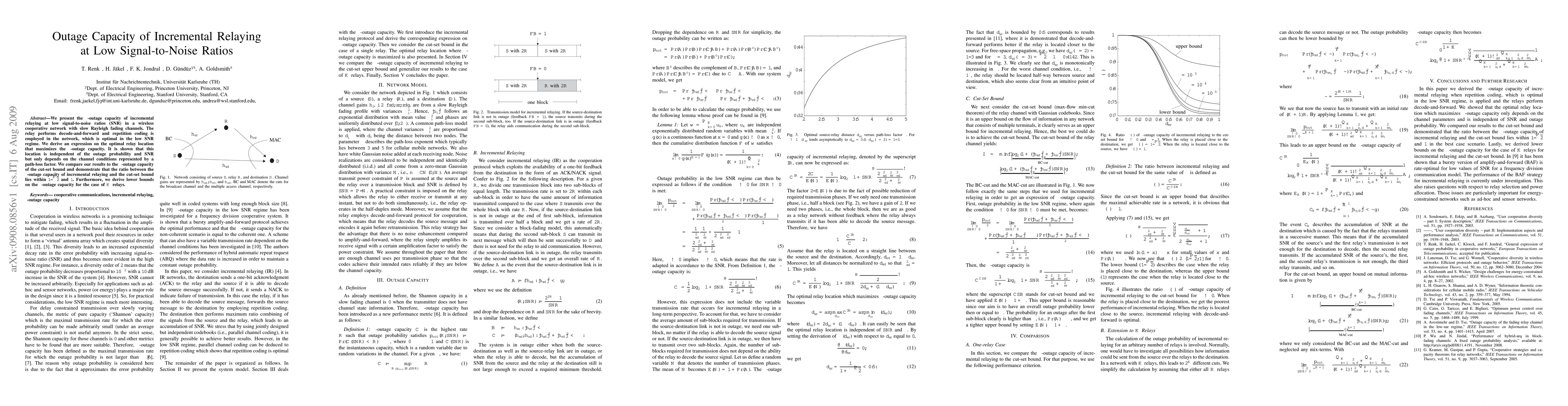 This paper investigates the \epsilon-outage capacity of incremental relaying in low SNR wireless networks with slow Rayleigh fading, showing that optimal relay location depends on path-loss factors rather than SNR or outage probability. It compares incremental relaying's performance to the cut-set bound, finding the ratio within 1/\sqrt{2} and 1, and derives lower bounds for K relays.