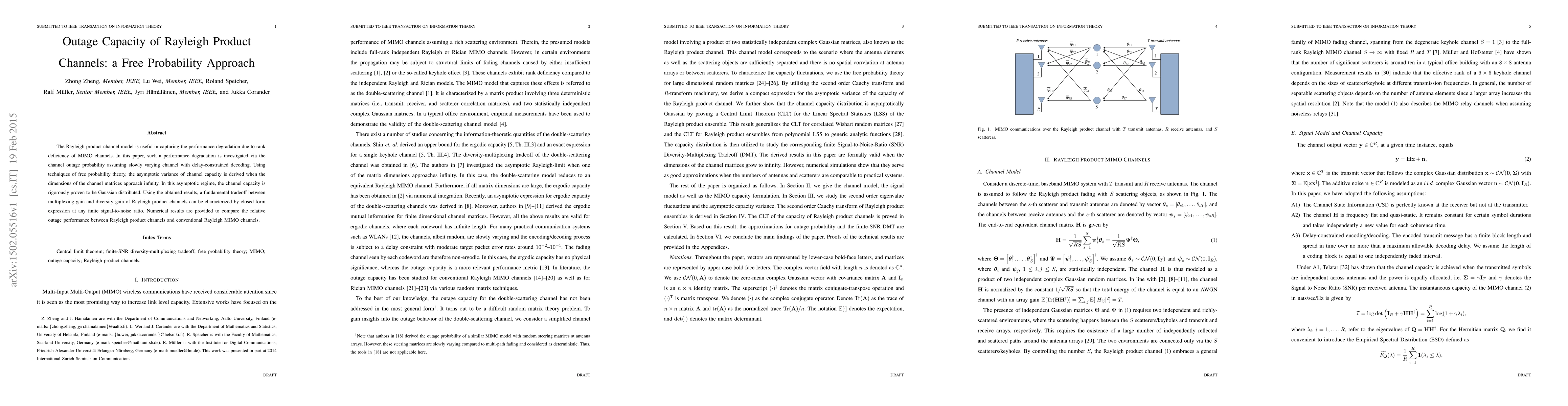 This paper investigates the outage capacity of Rayleigh product channels using free probability theory, deriving the asymptotic variance of channel capacity and proving its Gaussian distribution as dimensions grow. It characterizes the trade-off between multiplexing and diversity gain, providing numerical comparisons with conventional Rayleigh MIMO channels.