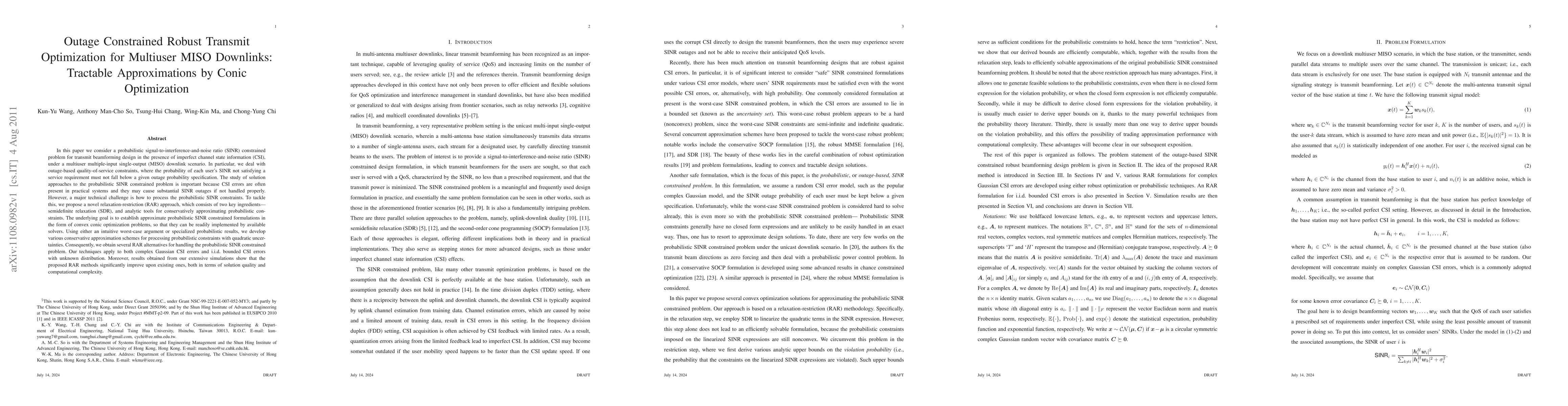 This paper proposes a novel relaxation-restriction (RAR) approach for optimizing transmit beamforming in multiuser MISO downlinks under probabilistic SINR constraints, addressing imperfect channel state information. The RAR approach combines semidefinite relaxation and conservative approximation techniques to convert complex probabilistic constraints into tractable convex conic optimization problems, significantly improving solution quality and computational efficiency compared to existing methods.