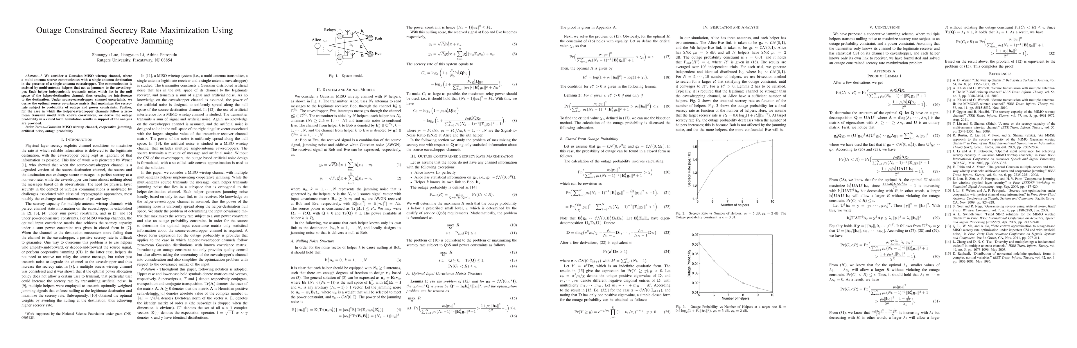 This paper maximizes secrecy rate in a Gaussian MISO wiretap channel with cooperative jamming, where multi-antenna helpers interfere with a single-antenna eavesdropper. The optimal source signal covariance matrix is derived under outage and power constraints, and the outage probability is calculated in closed form.
