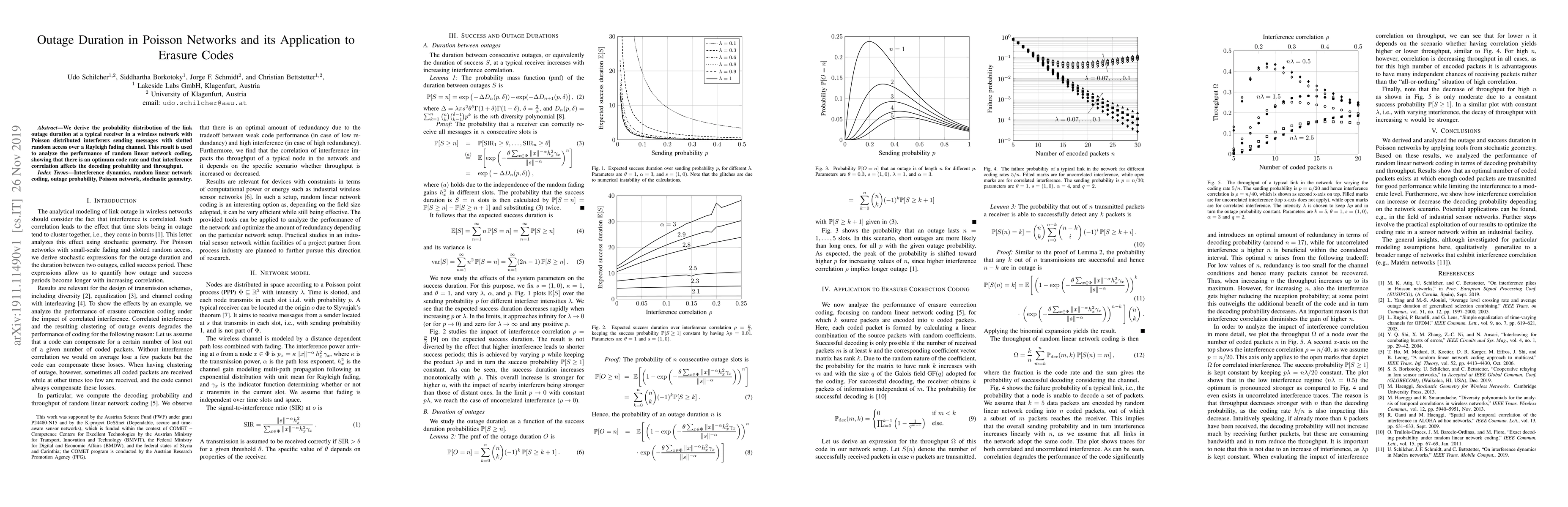 This paper derives the probability distribution of link outage duration in Poisson networks and applies it to analyze random linear network coding, revealing an optimal code rate and the impact of interference correlation on decoding probability and throughput.