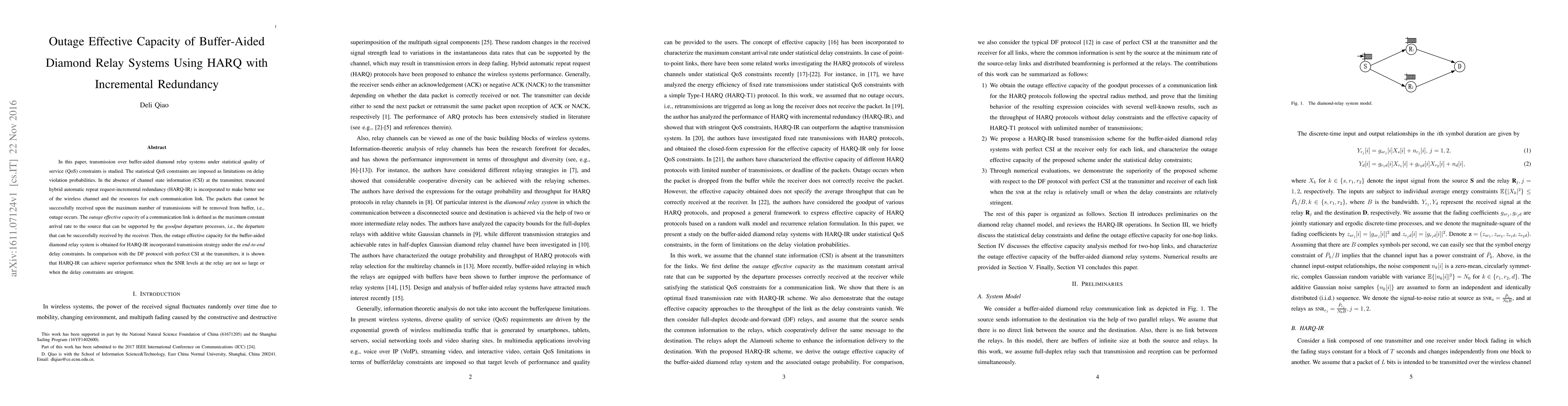 This paper investigates the outage effective capacity of buffer-aided diamond relay systems using HARQ with incremental redundancy under statistical QoS constraints. It demonstrates that HARQ-IR outperforms the DF protocol under stringent delay constraints, especially when relay SNR levels are moderate.