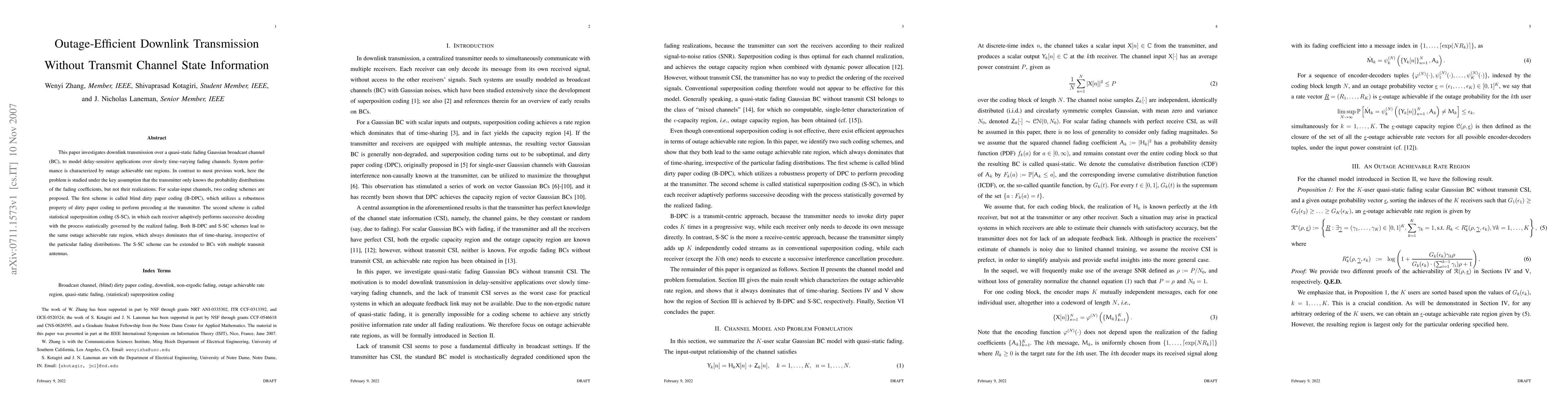 This paper investigates downlink transmission over a quasi-static fading Gaussian broadcast channel (BC), to model delay-sensitive applications over slowly time-varying fading channels. System performance is characterized by outage achievable rate regions. In contrast to most previous work, here the problem is studied under the key assumption that the transmitter only knows the probability distributions of the fading coefficients, but not their realizations. For scalar-input channels, two coding schemes are proposed. The first scheme is called blind dirty paper coding (B-DPC), which utilizes a robustness property of dirty paper coding to perform precoding at the transmitter. The second scheme is called statistical superposition coding (S-SC), in which each receiver adaptively performs successive decoding with the process statistically governed by the realized fading. Both B-DPC and S-SC schemes lead to the same outage achievable rate region, which always dominates that of time-sharing, irrespective of the particular fading distributions. The S-SC scheme can be extended to BCs with multiple transmit antennas.