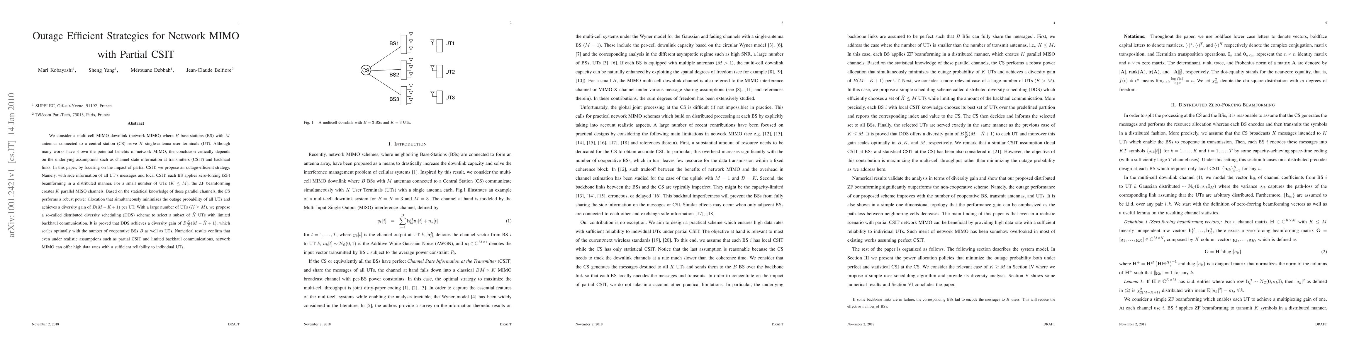 We consider a multi-cell MIMO downlink (network MIMO) where $B$ base-stations (BS) with $M$ antennas connected to a central station (CS) serve $K$ single-antenna user terminals (UT). Although many works have shown the potential benefits of network MIMO, the conclusion critically depends on the underlying assumptions such as channel state information at transmitters (CSIT) and backhaul links. In this paper, by focusing on the impact of partial CSIT, we propose an outage-efficient strategy. Namely, with side information of all UT's messages and local CSIT, each BS applies zero-forcing (ZF) beamforming in a distributed manner. For a small number of UTs ($K\leq M$), the ZF beamforming creates $K$ parallel MISO channels. Based on the statistical knowledge of these parallel channels, the CS performs a robust power allocation that simultaneously minimizes the outage probability of all UTs and achieves a diversity gain of $B(M-K+1)$ per UT. With a large number of UTs ($K \geq M$), we propose a so-called distributed diversity scheduling (DDS) scheme to select a subset of $\Ks$ UTs with limited backhaul communication. It is proved that DDS achieves a diversity gain of $B\frac{K}{\Ks}(M-\Ks+1)$, which scales optimally with the number of cooperative BSs $B$ as well as UTs. Numerical results confirm that even under realistic assumptions such as partial CSIT and limited backhaul communications, network MIMO can offer high data rates with a sufficient reliability to individual UTs.