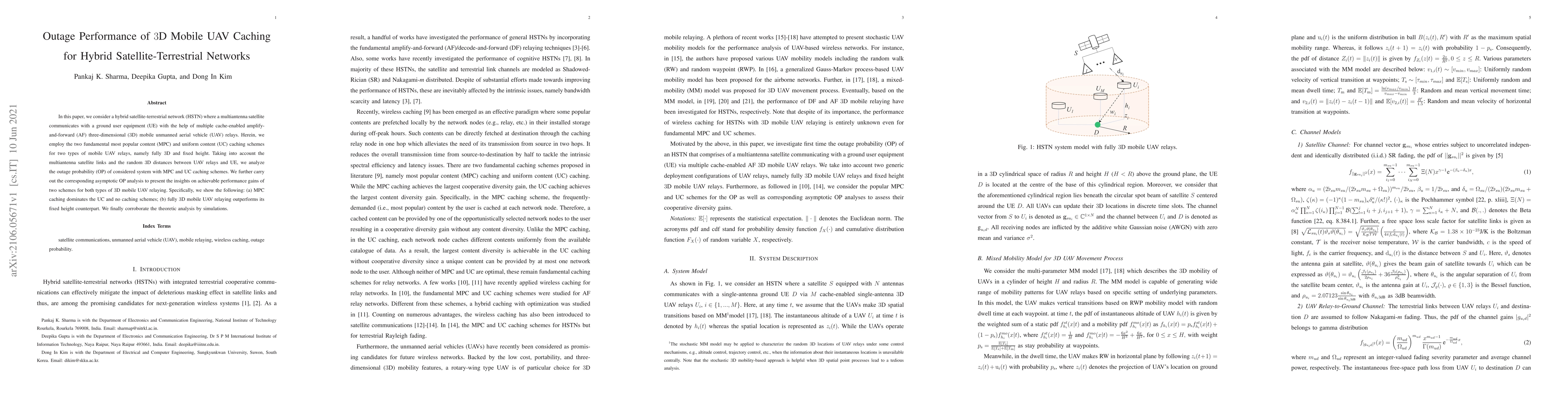 This paper investigates the outage performance of a hybrid satellite-terrestrial network using 3D mobile UAV caching for relaying, comparing two caching schemes: MPC and UC. It finds that MPC caching outperforms UC and no caching, and fully 3D UAV relaying is more effective than fixed height UAV relaying, corroborated by theoretical analysis and simulations.