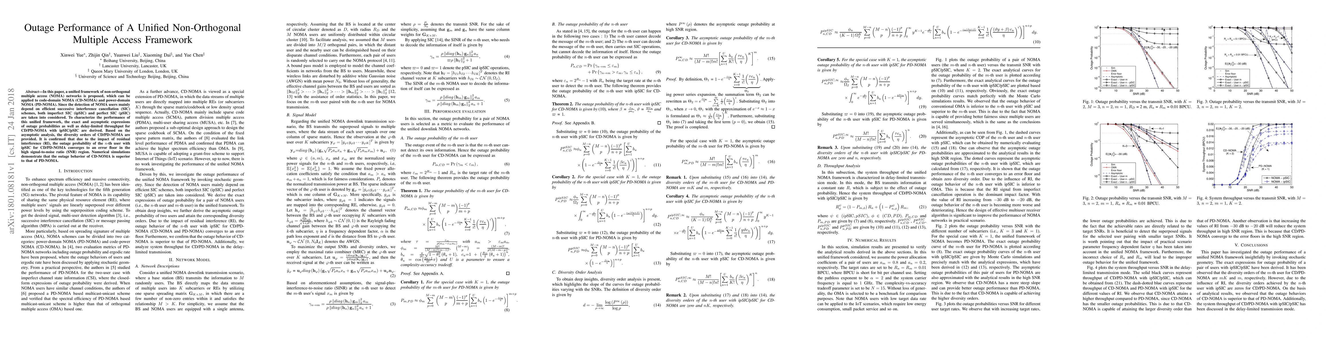 This paper proposes a unified framework for non-orthogonal multiple access (NOMA) networks, analyzing both code-domain and power-domain NOMA with imperfect and perfect successive interference cancellation. The study derives outage probabilities and throughput expressions, revealing that CD-NOMA outperforms PD-NOMA in outage behavior due to residual interference effects.