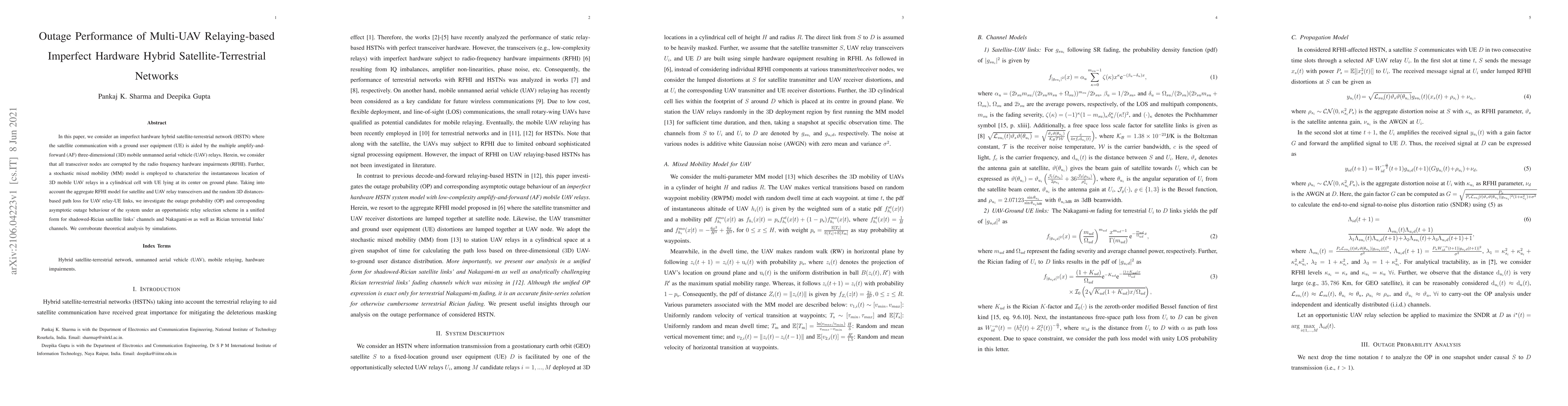 This paper investigates the outage performance of a multi-UAV relaying-based imperfect hardware hybrid satellite-terrestrial network, considering hardware impairments and stochastic mobility. It analyzes outage probability under an opportunistic relay selection scheme for shadowed-Rician and Nakagami-m channels.