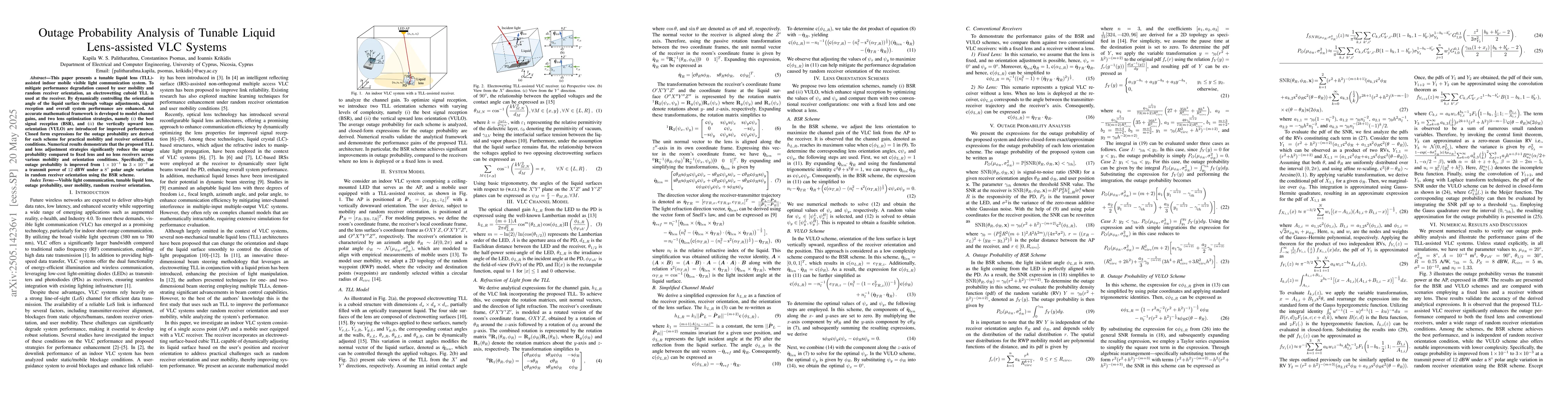 Development of an accurate mathematical framework for modeling channel gains in TLL-assisted VLC systems and derivation of closed-form expressions for outage probability under different lens optimization strategies.