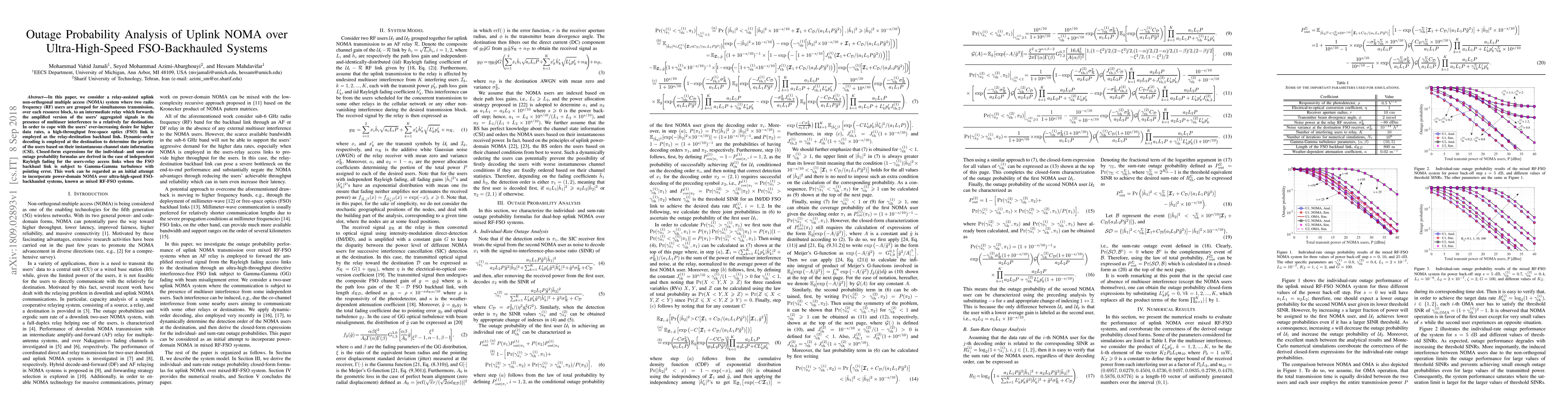 This paper analyzes the outage probability in a relay-assisted uplink NOMA system over an ultra-high-speed FSO-backhauled network, employing dynamic-order decoding and deriving closed-form expressions for individual- and sum-rate outage probabilities under Gamma-Gamma turbulence and pointing error conditions.