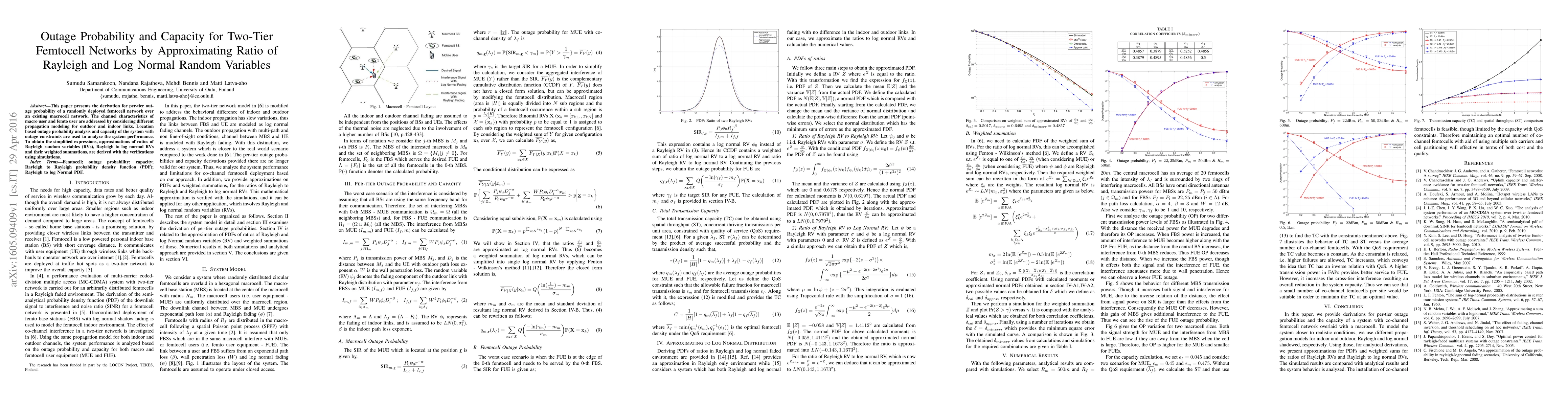 This paper derives expressions for per-tier outage probability in a two-tier femtocell network overlaying a macrocell network, considering different propagation models for outdoor and indoor links. It uses approximations for ratios of Rayleigh and log-normal random variables to simplify the analysis, validated through simulations.