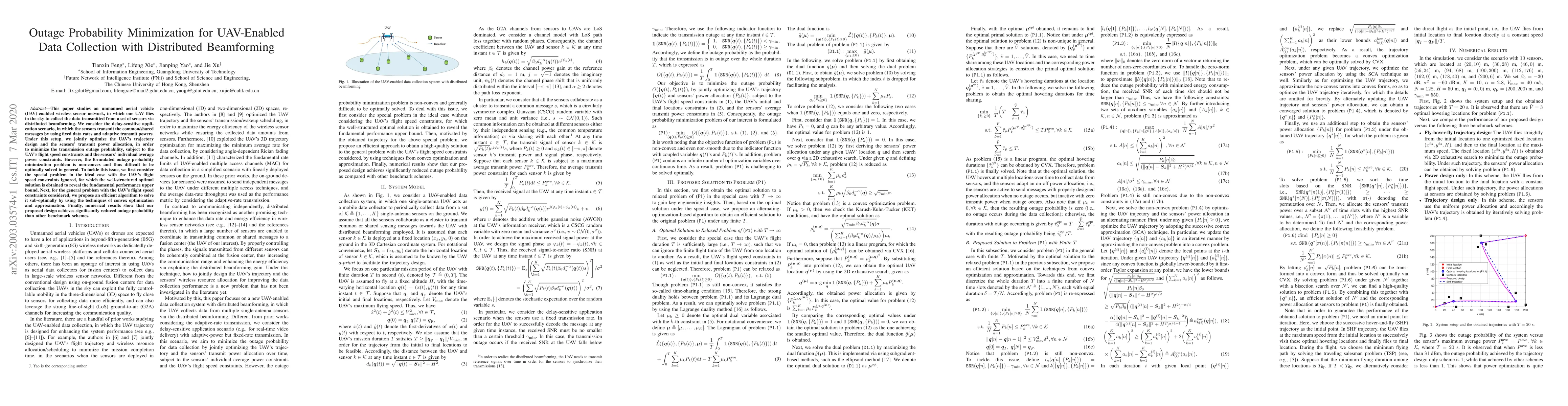 This paper optimizes UAV-enabled data collection with distributed beamforming to minimize transmission outage probability, addressing constraints on UAV speed and sensor power. An efficient sub-optimal algorithm is proposed to solve the non-convex problem, achieving significantly lower outage probability compared to benchmark schemes.
