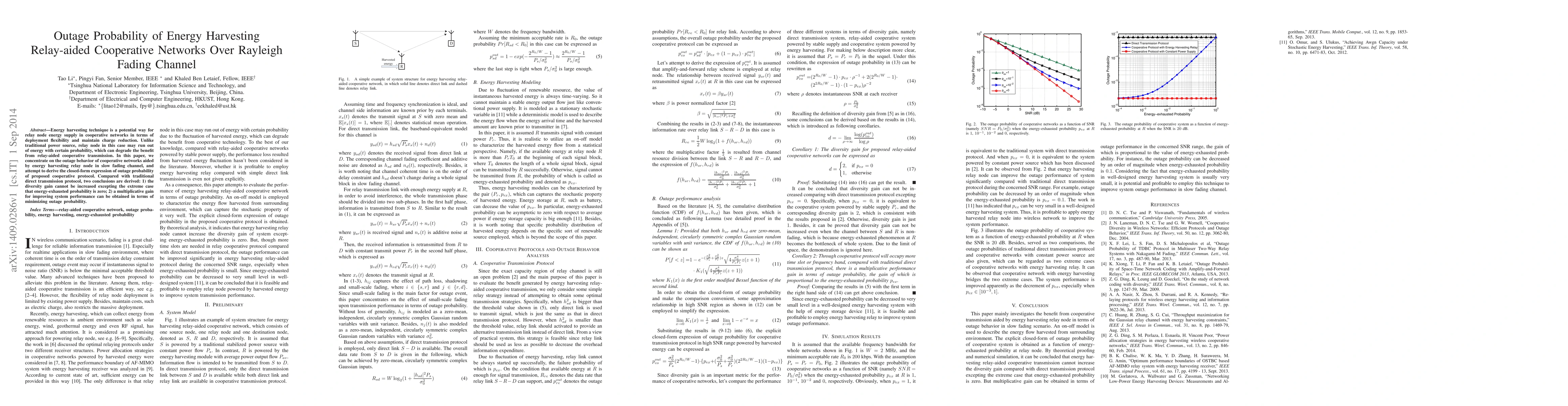 This paper investigates the outage probability of cooperative networks utilizing an energy harvesting relay node over Rayleigh fading channels. The study derives a closed-form expression for outage probability and finds that while diversity gain is limited, a multiplicative gain can improve system performance by minimizing outage probability compared to traditional direct transmission.