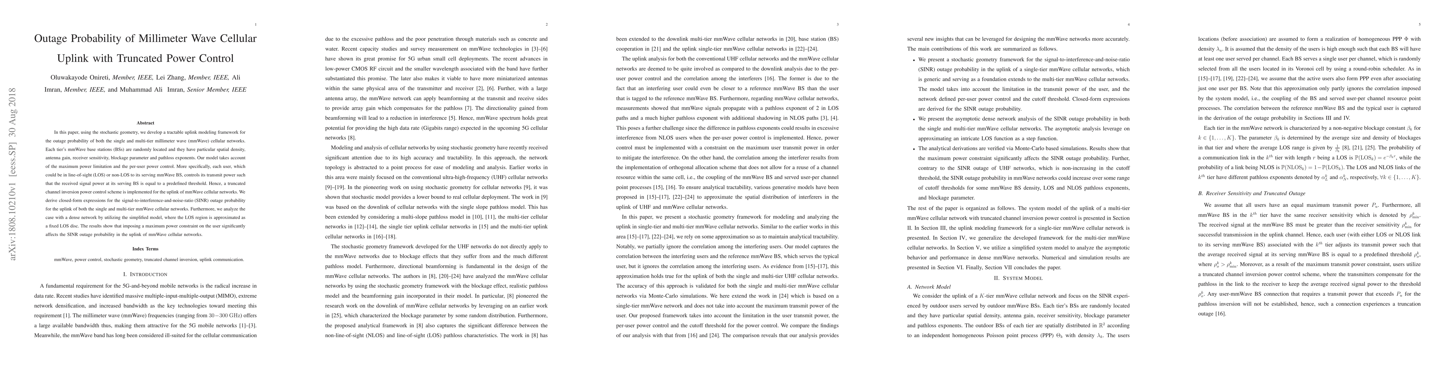 This paper develops a stochastic geometry framework to model the outage probability in millimeter wave cellular uplink networks with truncated power control. It derives closed-form expressions for the signal-to-interference-and-noise-ratio (SINR) outage probability, showing that maximum power constraints significantly impact performance.