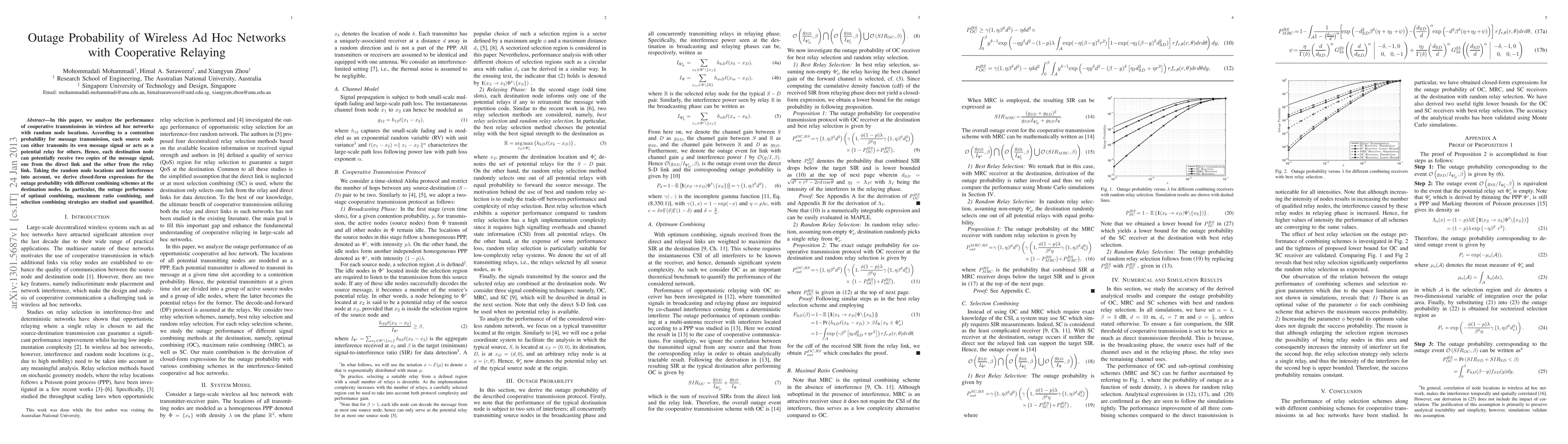 This paper analyzes the outage probability in wireless ad hoc networks employing cooperative relaying, deriving closed-form expressions for different combining schemes under random node locations and interference. It evaluates the performance of optimal, maximum ratio, and selection combining strategies.