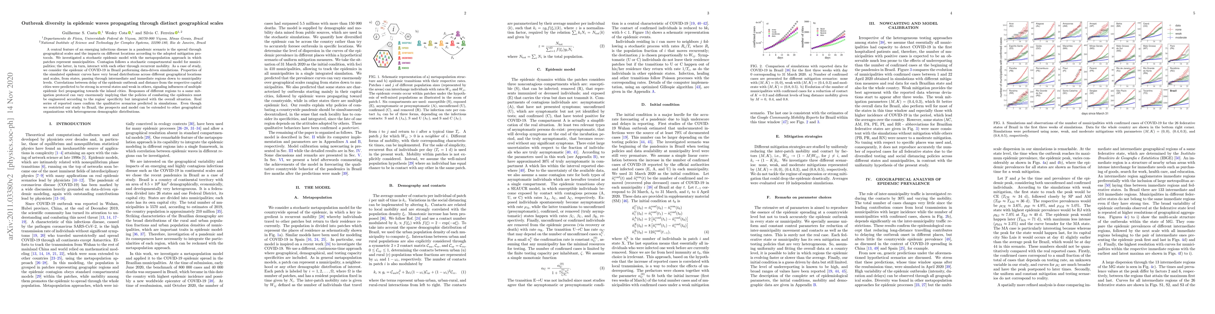 A central feature of an emerging infectious disease in a pandemic scenario is the spread through geographical scales and the impacts on different locations according to the adopted mitigation protocols. We investigated a stochastic epidemic model with the metapopulation approach in which patches represent municipalities. Contagion follows a stochastic compartmental model for municipalities; the latter, in turn, interact with each other through recurrent mobility. As a case of study, we consider the epidemic of COVID-19 in Brazil performing data-driven simulations. Properties of the simulated epidemic curves have very broad distributions across different geographical locations and scales, from states, passing through intermediate and immediate regions down to municipality levels. Correlations between delay of the epidemic outbreak and distance from the respective capital cities were predicted to be strong in several states and weak in others, signaling influences of multiple epidemic foci propagating towards the inland cities. Responses of different regions to a same mitigation protocol can vary enormously implying that the policies of combating the epidemics must be engineered according to the region' specificity but integrated with the overall situation. Real series of reported cases confirm the qualitative scenarios predicted in simulations. Even though we restricted our study to Brazil, the prospects and model can be extended to other geographical organizations with heterogeneous demographic distributions.