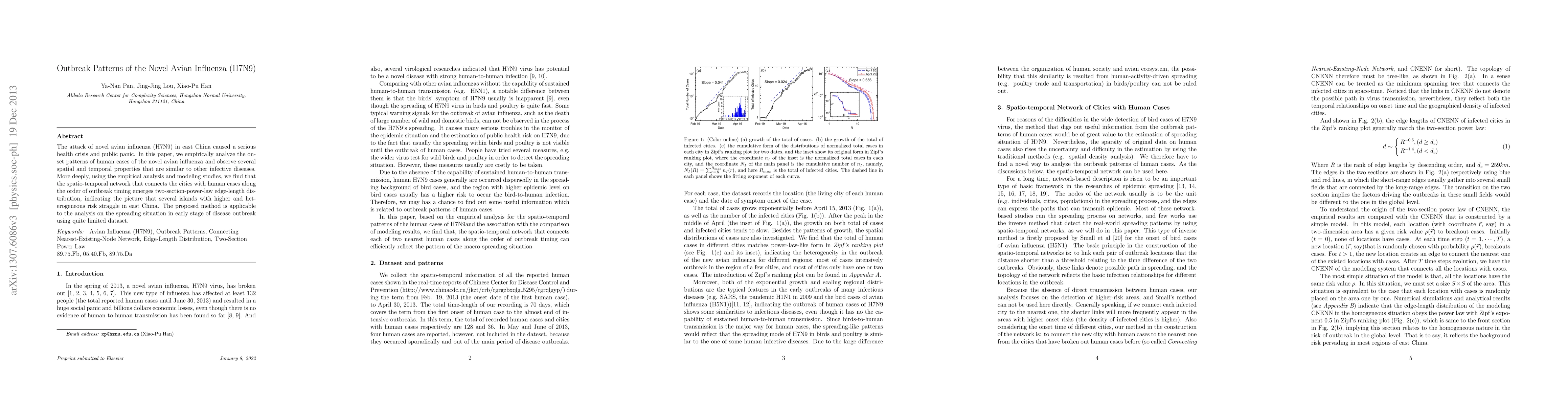 A study analyzed the outbreak patterns of H7N9 avian influenza in east China, finding a two-section-power-law edge-length distribution that indicates higher risk areas scattered throughout the region. The research suggests its applicability to early-stage disease outbreaks with limited data.